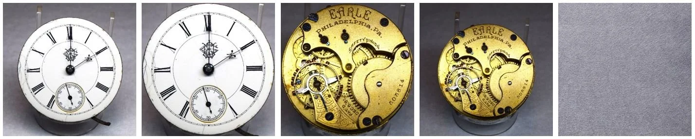 “Earle Watch Company” is a private label within Seth Thomas Model 2, Model 3, and Model 14. Some of the Earle Watch Company dials are signed with an EWC cluster monogram. Others are signed EARLE in all capital letters. The Earle Watch Company private label pocket watches were manufactured by Seth Thomas for William G. Earle, a Philadelphia jeweler born in 1850, whose store was first located at 13 N. 9th Street and later at 1030 Market Street, from 1881 until his death in 1915. William G. Earle served as a Carrier for the U.S. Postal Service from 1871-1881, prior to becoming a jeweler.