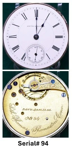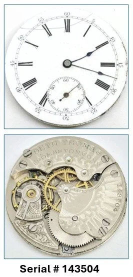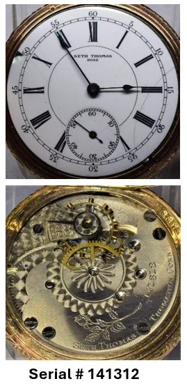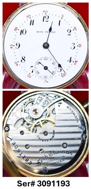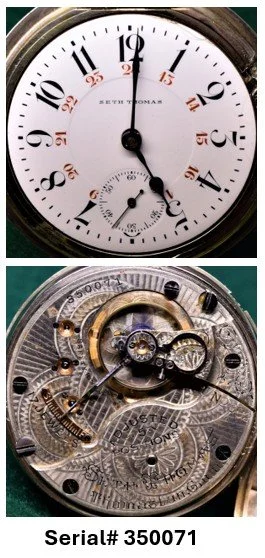 The serial number for the mechanism can be found in a number of different locations on the top plate, around the perimeter or in the central area of the movement depending on the specific model; but if a movement has a serial number, it is ALWAYS on the mechanism, NEVER on the watch case. Model 10 and Model 11 Seth Thomas movements have no serial numbers. Some Seth Thomas Model 12 and Model 13 movements have no serial number, and some do have a serial number.