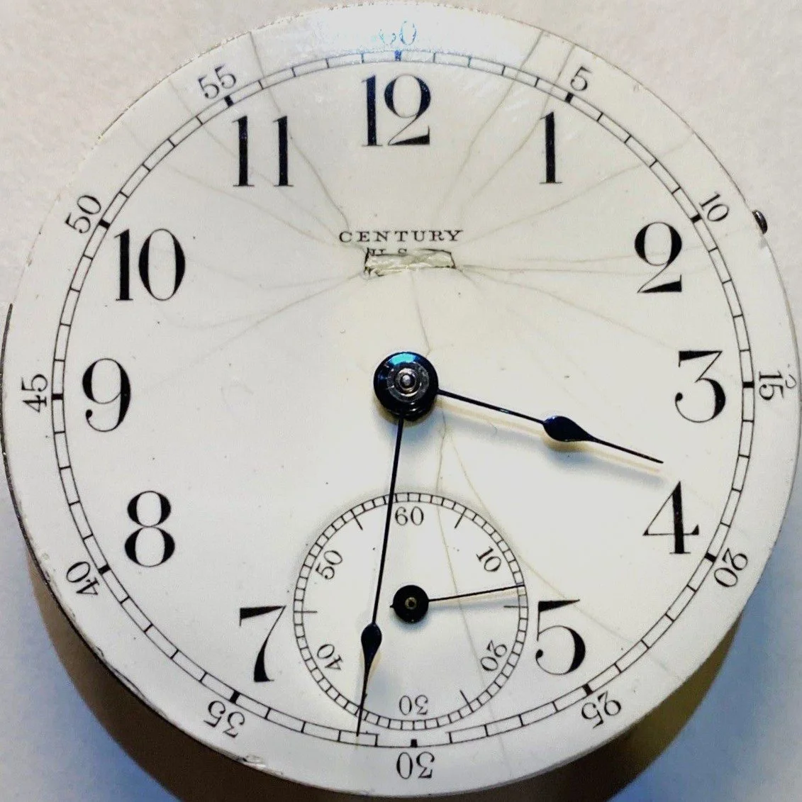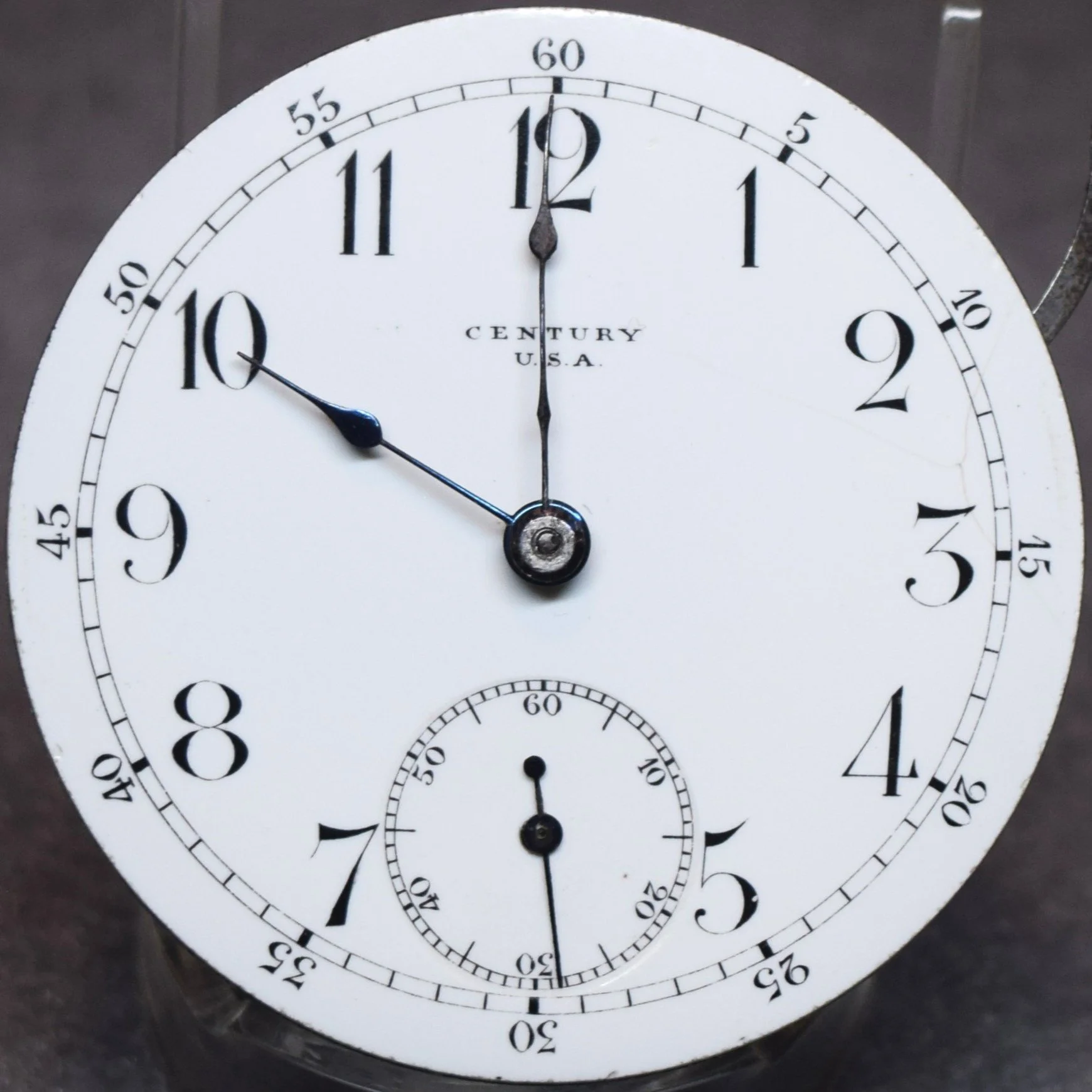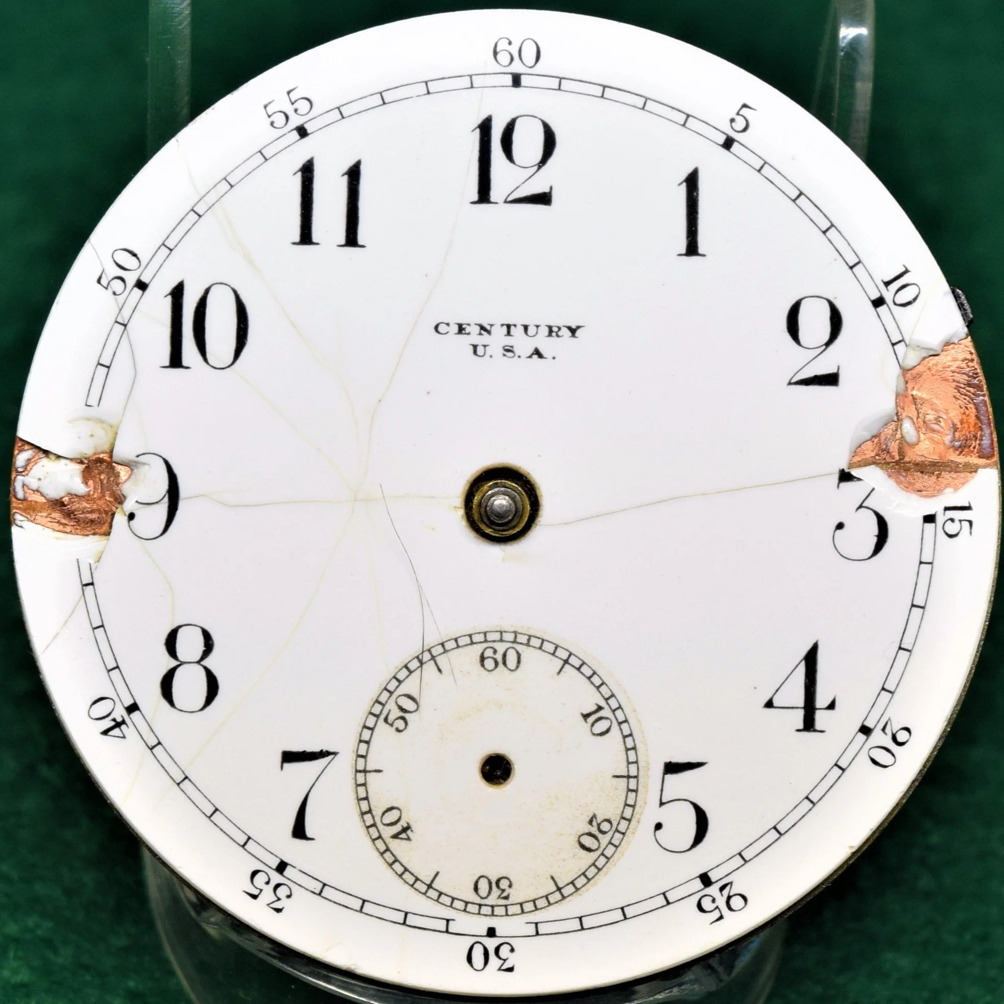 The movement presents with an 18-size named private label "CENTURY U.S.A." #1255 Arabic dial with a ring minute track and black five-minute marginals. No hands presently. Century U.S.A. is a Seth Thomas Named Grade in Seth Thomas Model 10, Model 11, Model 12, Model 13, Model 18, and Model 24.