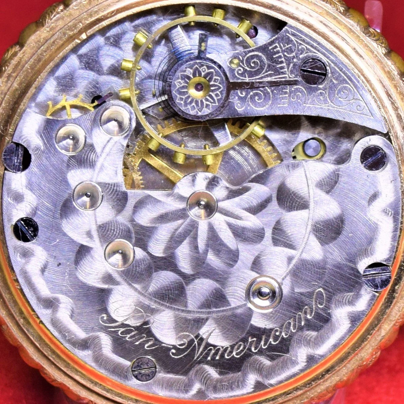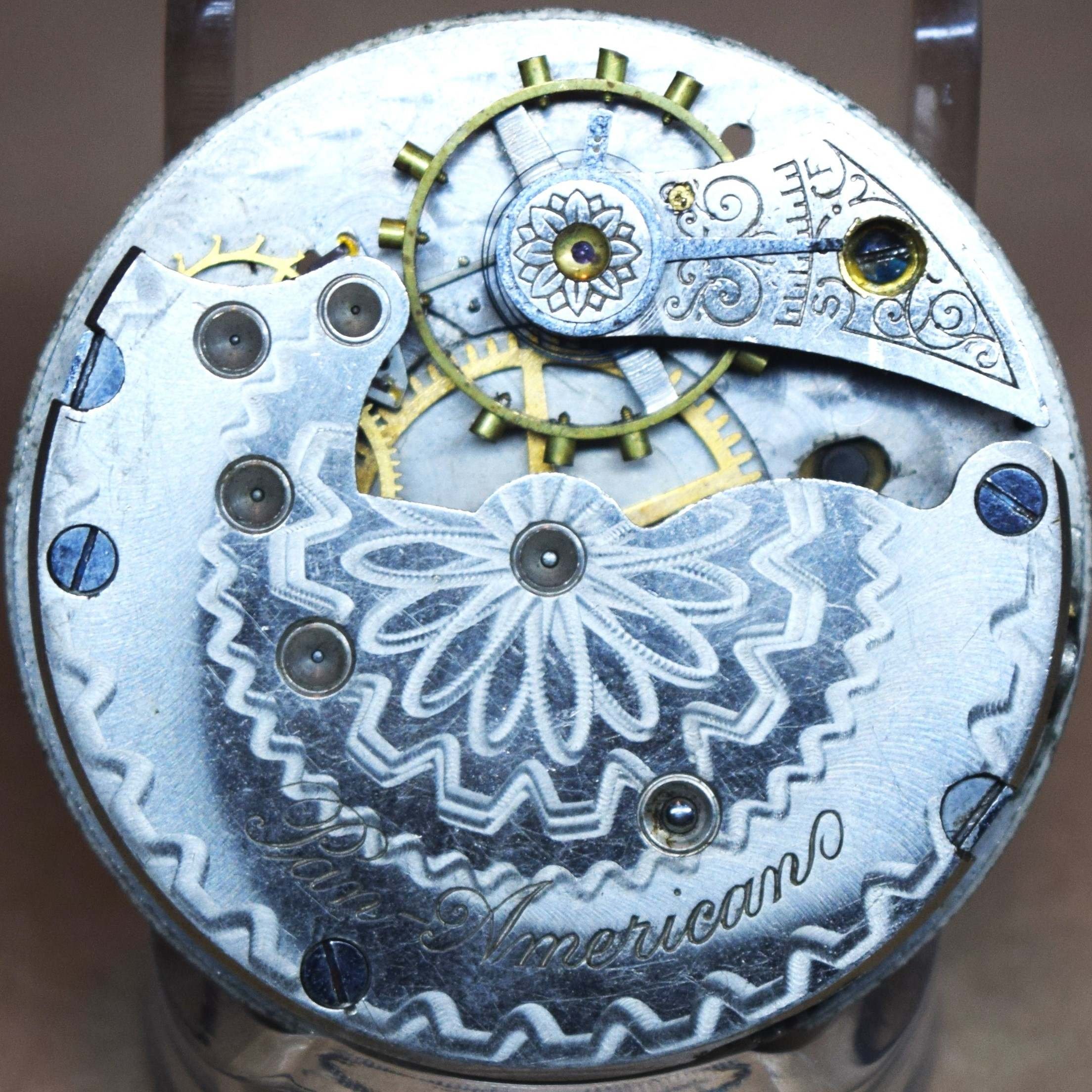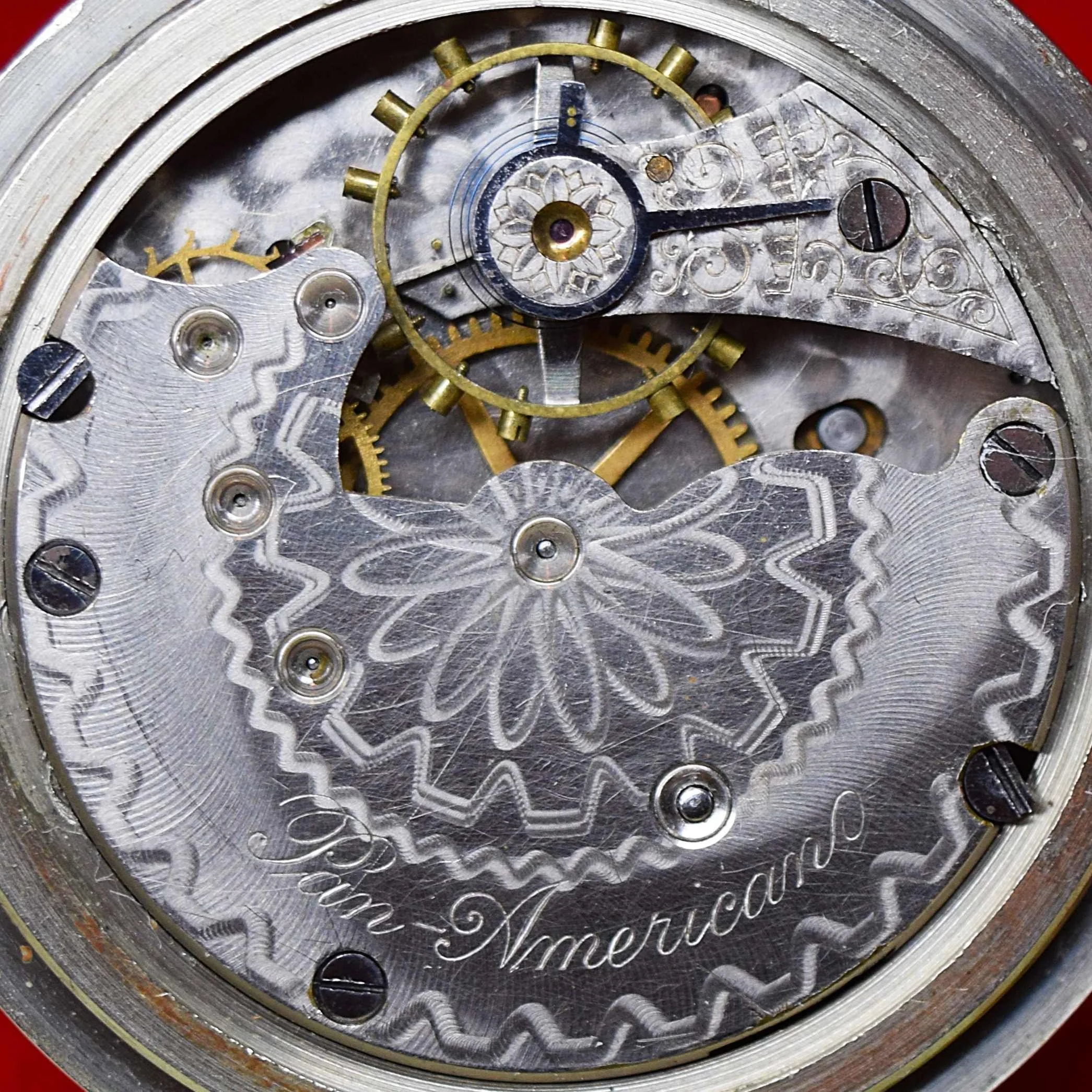 This Seth Thomas open-face 18-size Model 10 pocket watch was manufactured with a nickel finished 3/4 plate, 7 jewels, and it is non-adjusted. The movement is stem wound and lever set, with a flat hair spring and simple/plain regulator. Its SETH THOMAS FAN Serial Number is PANAMERICAN10A, and its grade is Seth Thomas named grade Century. The private label movement is signed “Pan-American”.