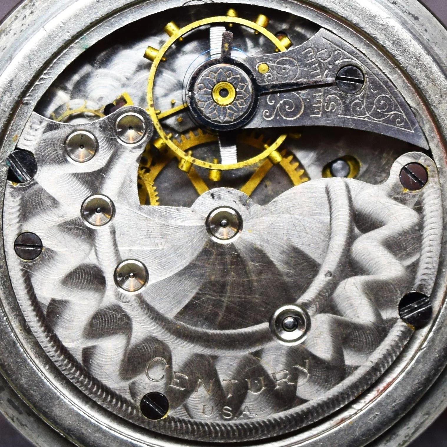 This Seth Thomas open-face 18-size Model 10 pocket watch was manufactured with a nickel finished 3/4 plate, 7 jewels, and it is non-adjusted. The movement is stem wound and lever set, with a flat hair spring and simple/plain regulator. Its SETH THOMAS FAN Serial Number is CENTURY10B, and its grade is Seth Thomas named grade Century. The movement is signed “CENTURY U.S.A.”.