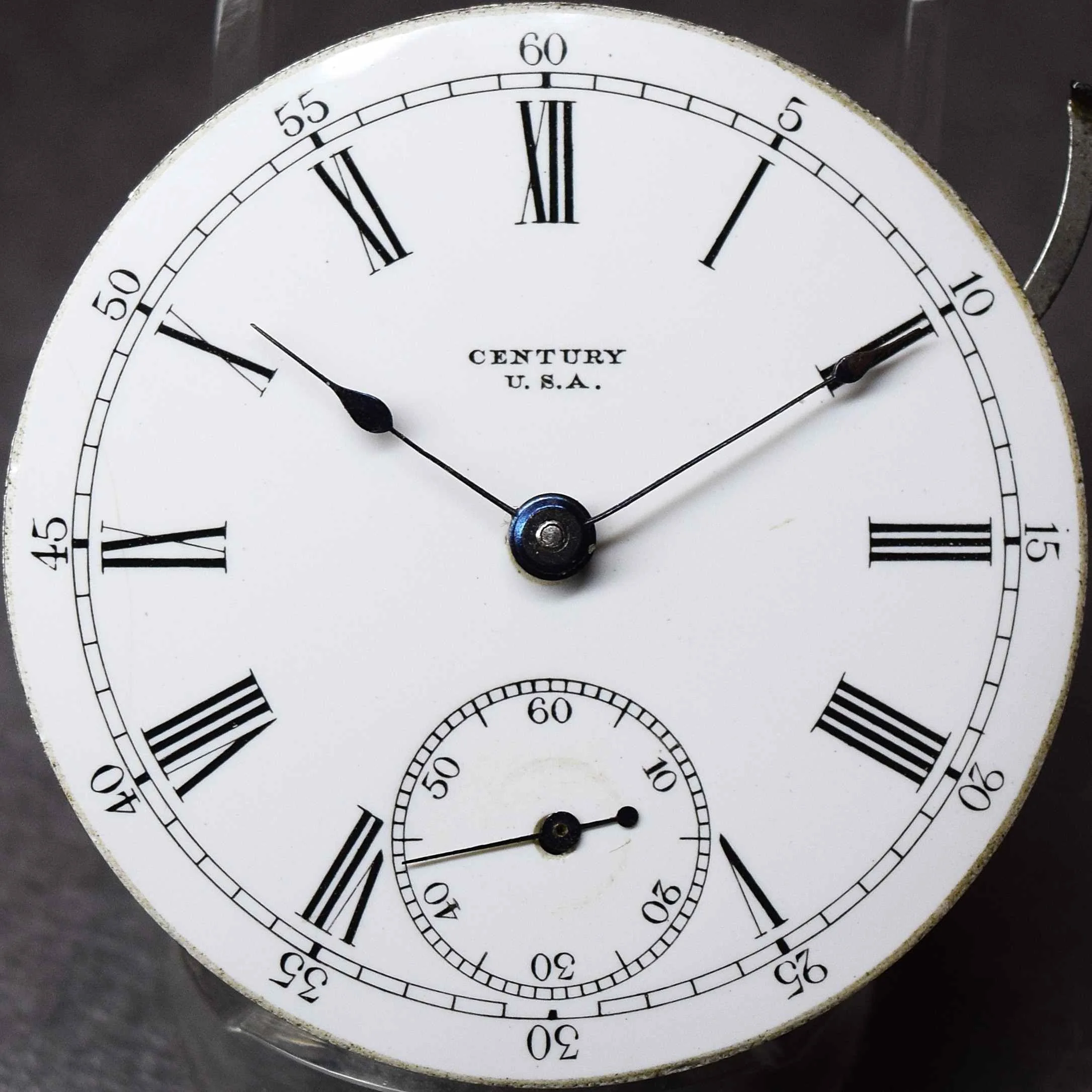The movement presents with an 18-size private label "CENTURY U.S.A." #1254 Roman dial with a ring minute track and black five-minute marginals; fitted with Seth Thomas #1281 blued spade hands 18-size. Century U.S.A. is a Seth Thomas Named Grade in Seth Thomas Model 10, Model 11, Model 12, Model 13, Model 18, and Model 24.