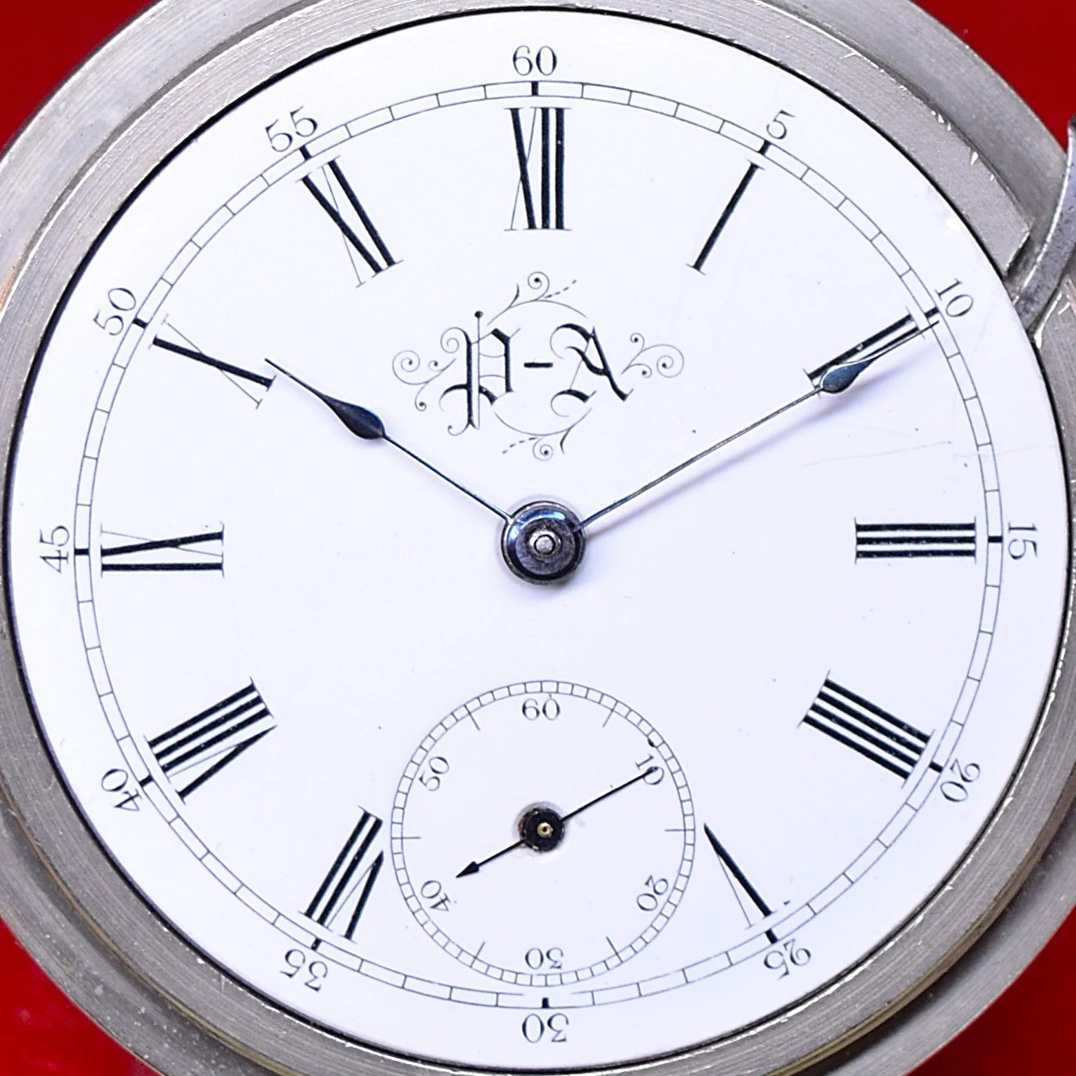 The movement is cased in an 18-size nickel open-face pocket watch case with hinged back and bezel.