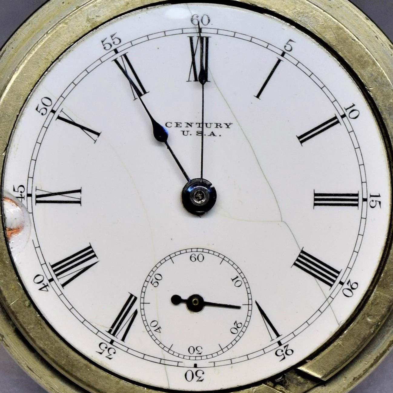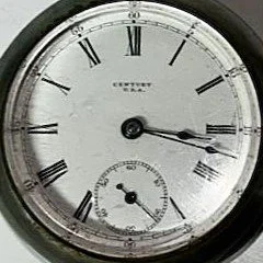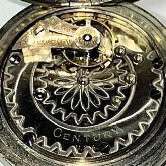 This Seth Thomas 18-size hunting Model 11 pocket watch was manufactured with a nickel finished 3/4 plate, 7 jewels, and it is non-adjusted. The movement is stem wound and lever set, with a flat hair spring and plain/simple regulator. Its SETH THOMAS FAN Serial Number is CENTURY11C, and its grade is Seth Thomas named grade Century. The movement is signed “CENTURY U.S.A.”.