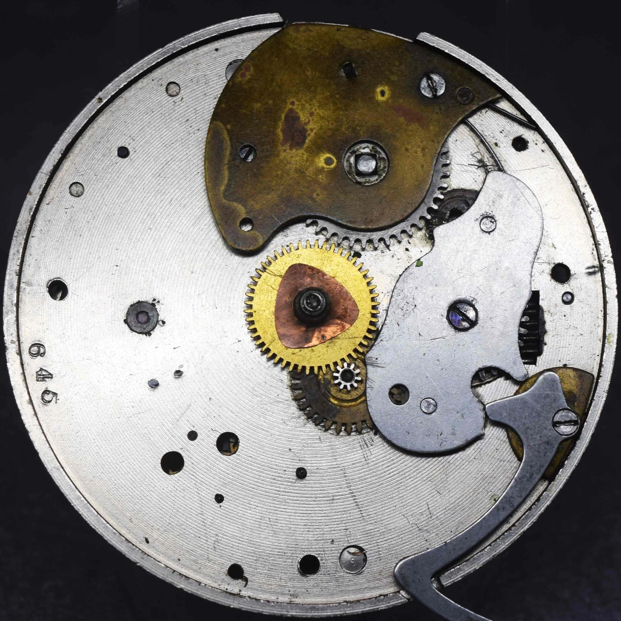 This Seth Thomas 18-size hunting Model 11 pocket watch was manufactured with a nickel finished 3/4 plate, 7 jewels, and it is non-adjusted. The movement is stem wound and lever set, with a flat hair spring, and plain/simple regulator. Its SETH THOMAS FAN Serial Number is CENTURY11A, and its grade is Seth Thomas named grade Century. The movement is signed “CENTURY U.S.A.”. Since none of the Seth Thomas Model 11 pocket watches have serial numbers marked on their top plate it is not possible to accurately state what order they were manufactured in. Partial serial numbers can be seen beneath the dial stamped on the pillar plate as seen (645) below. Unfortunately many are not stamped clearly. There are no known records of anyone’s attempt to catalog these numbers and see which “unassigned” serial number blocks they may have been manufactured from. This knowledge could help us to better understand when they were manufactured.