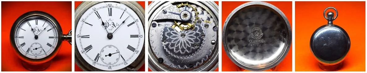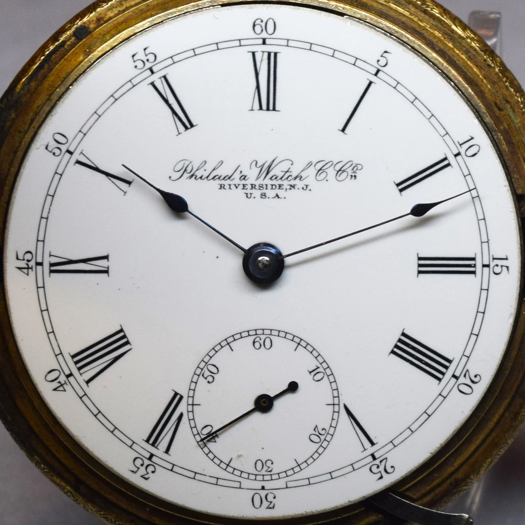 The movement is cased in an 18-size Philadelphia Watch Case Company open-face Silverode (nickel) pocket watch case with screw back and bezel, serial number 145573.