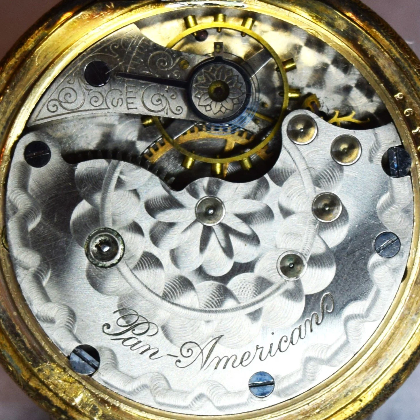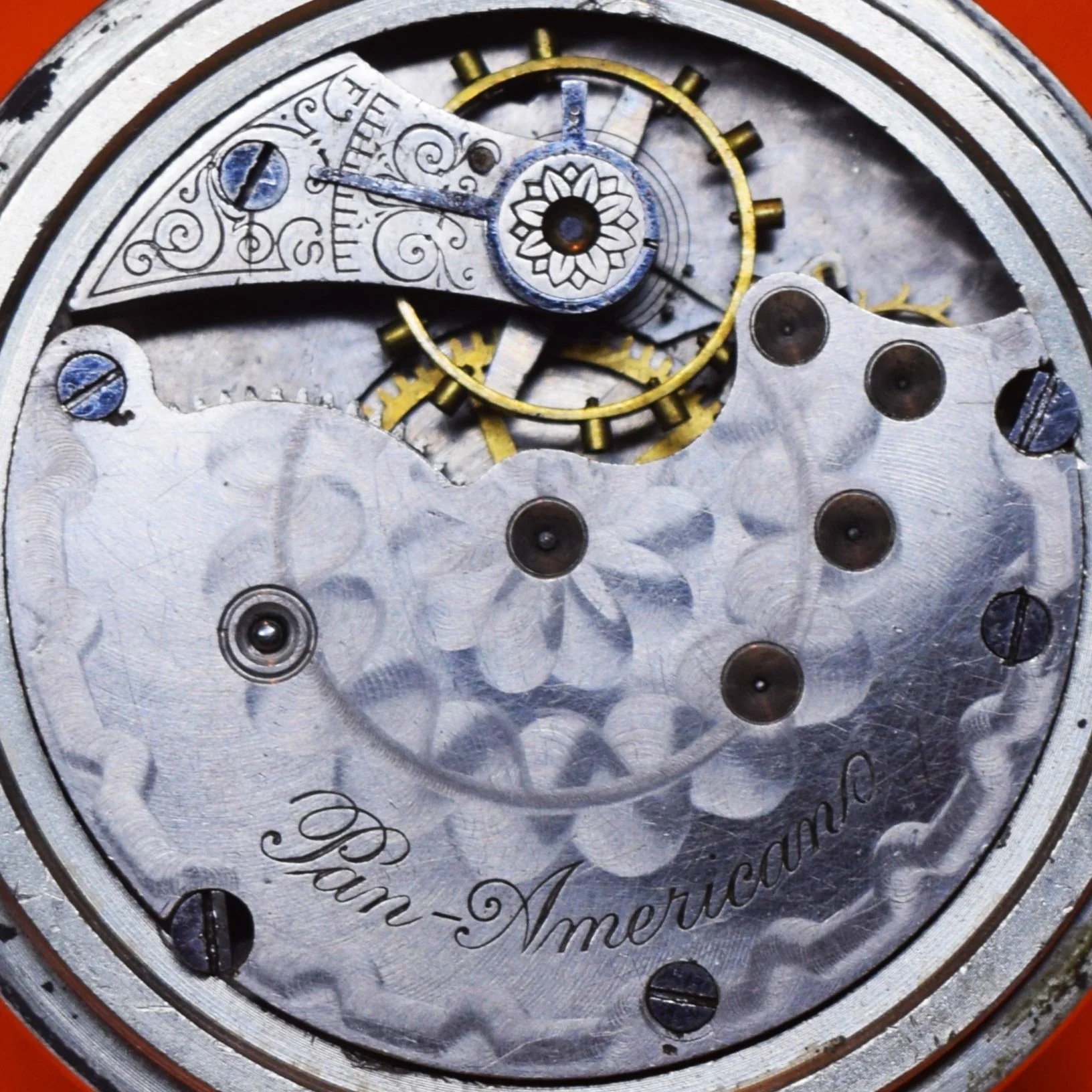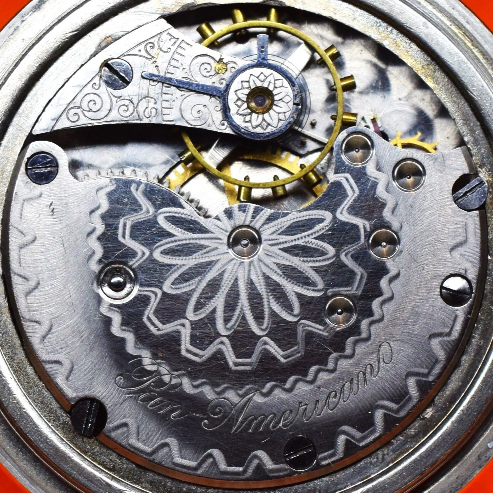 The movement presents with an 18-size private label "P.W.C.Co" Roman dial with a ring minute track and black five-minute marginals; fitted with Seth Thomas #1281 blued spade hands 18-size. P.W.C.Co stands for Philadelphia Watch Case Company. Many of the private label “Pan-American” pocket watches are fitted with this additional private label dial.