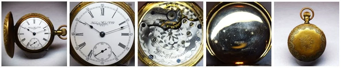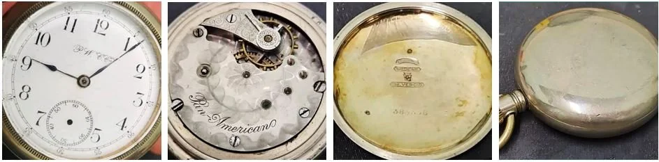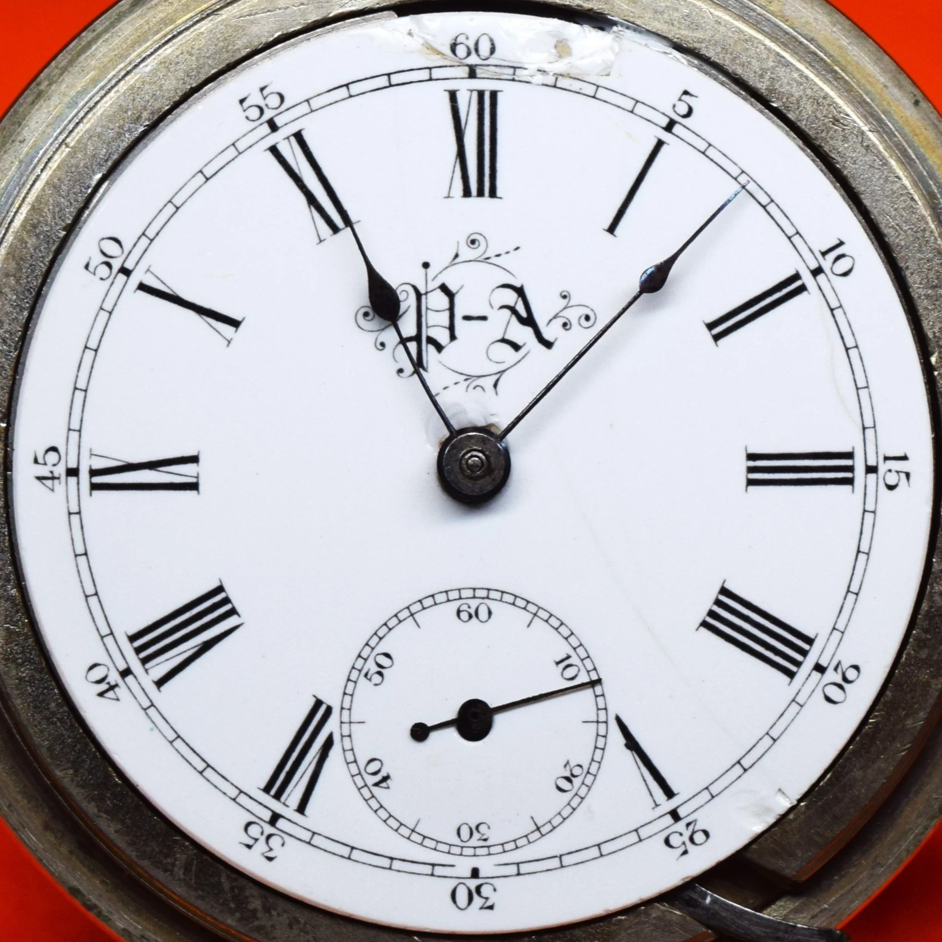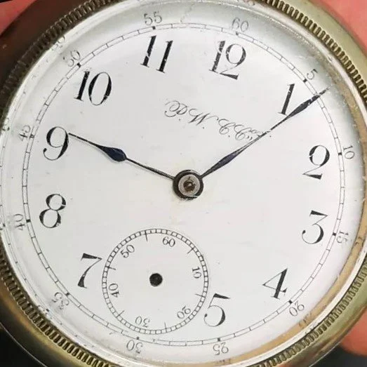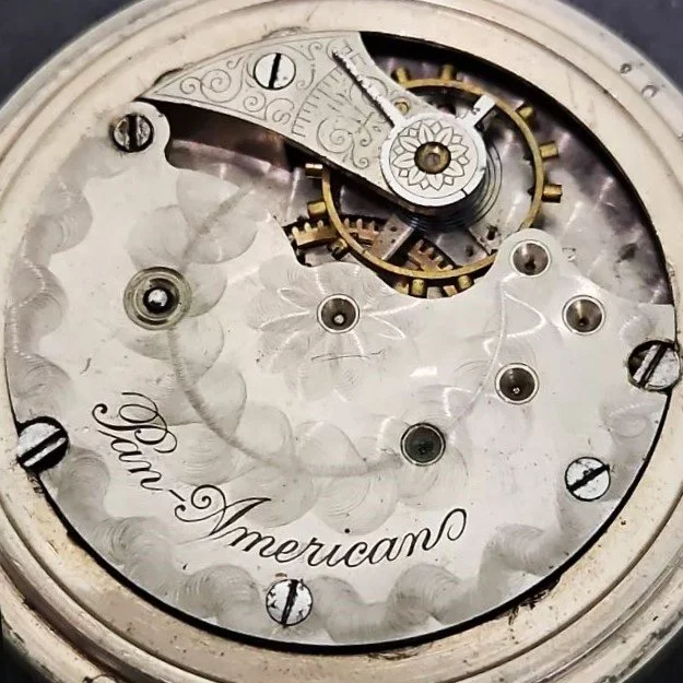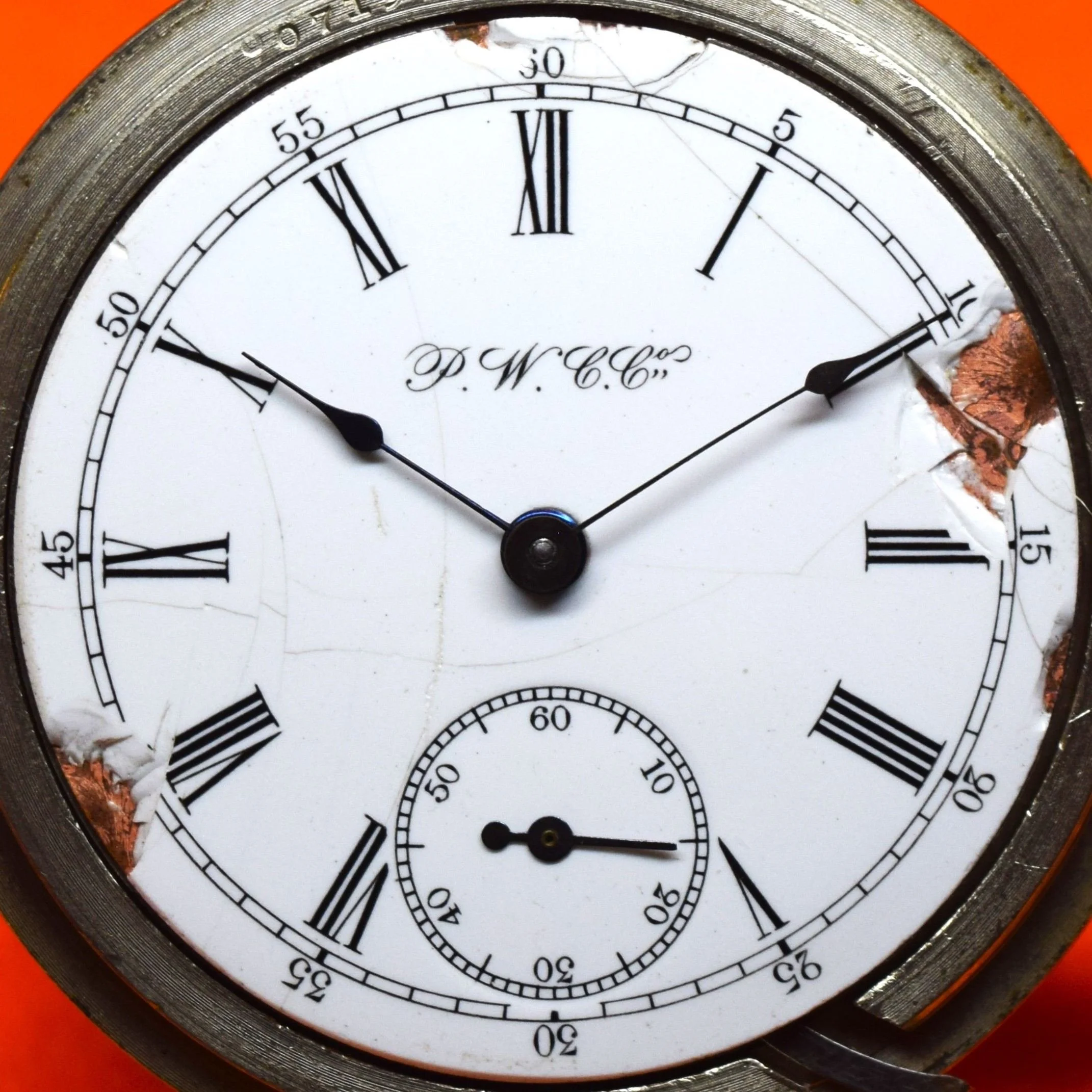 The movement presents with an 18-size private label "P.W.C.Co" Roman dial with a ring minute track and black five-minute marginals; fitted with Seth Thomas #1281 blued spade hands 18-size. P.W.C.Co stands for Philadelphia Watch Case Company. Many of the private label “Pan-American” pocket watches are fitted with this additional private label dial.