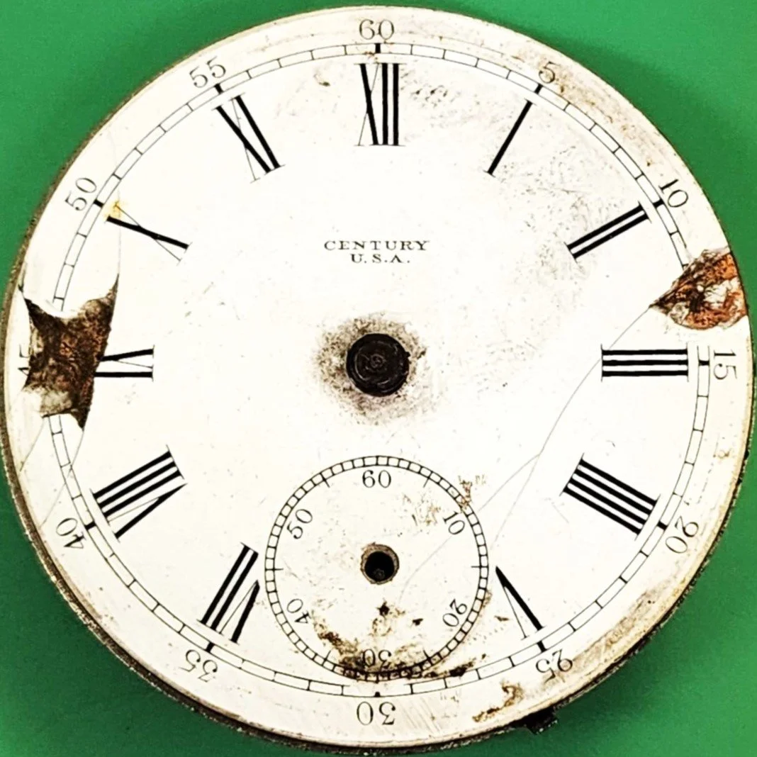The movement presents with an 18-size private label "CENTURY U.S.A." #1254 Roman dial with a ring minute track and black five-minute marginals. No hands at this time. Century U.S.A. is a Seth Thomas Named Grade in Seth Thomas Model 10, Model 11, Model 12, Model 13, Model 18, and Model 24.