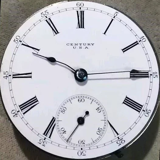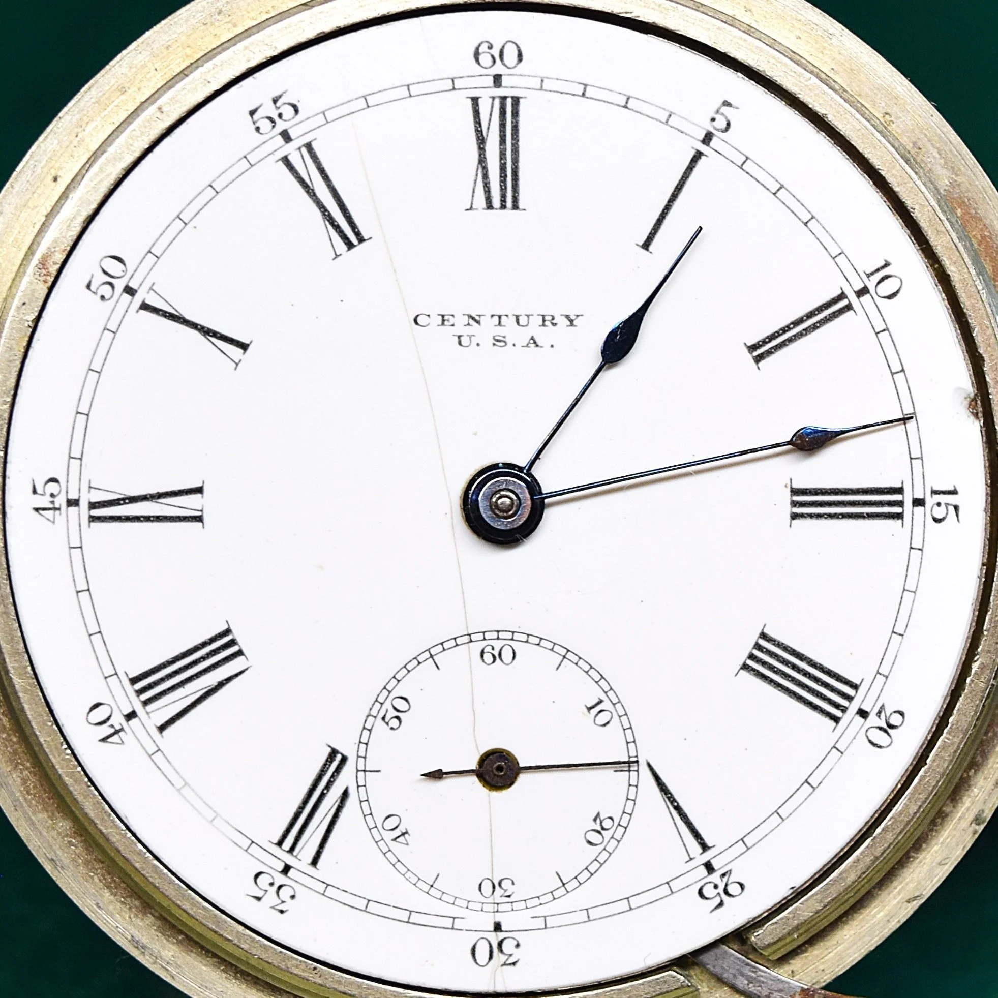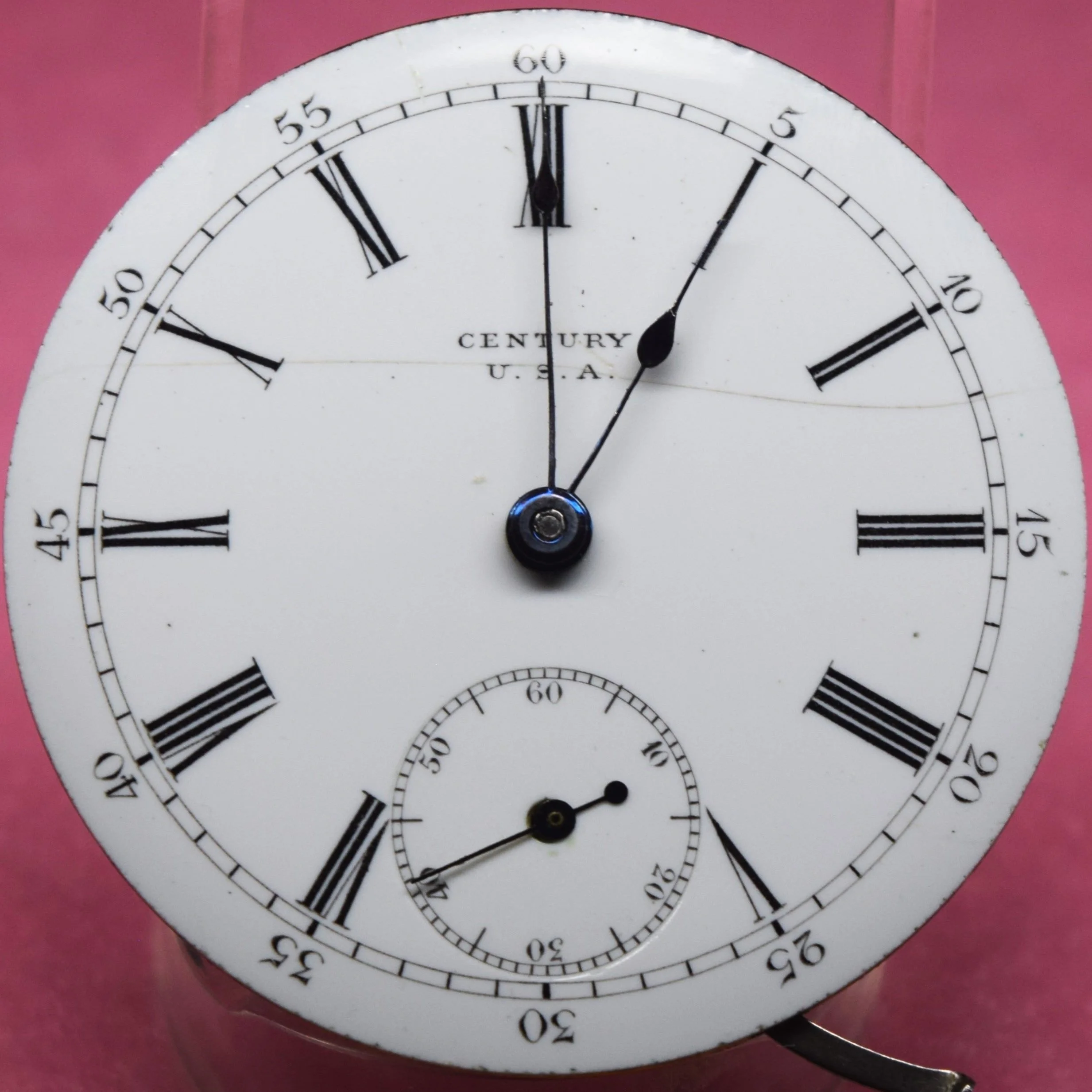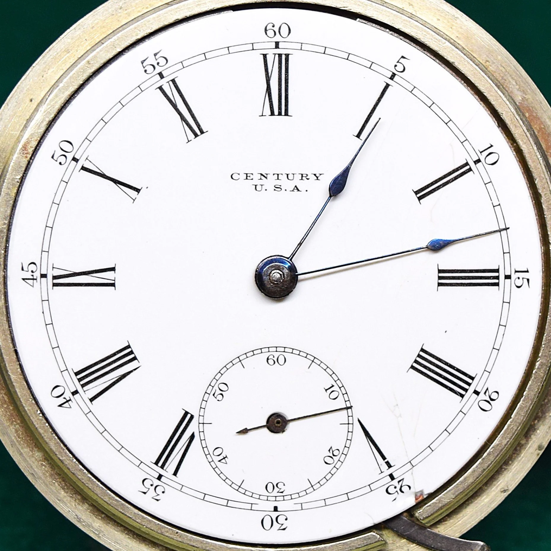 The movement presents with an 18-size private label "CENTURY U.S.A." #1254 Roman dial with a ring minute track and black five-minute marginals; fitted with Seth Thomas #1281 blued spade hands 18-size. Century U.S.A. is a Seth Thomas Named Grade in Seth Thomas Model 10, Model 11, Model 12, Model 13, Model 18, and Model 24 used as a trade name on pocket watch movements manufactured for Sears, Roebuck & Co. by Seth Thomas Watch Co.