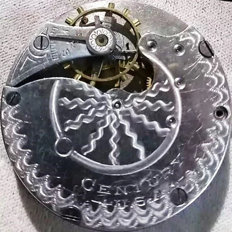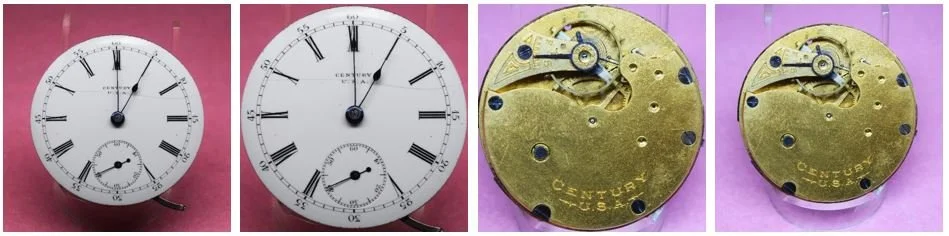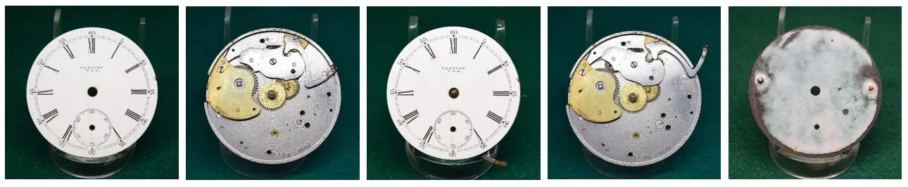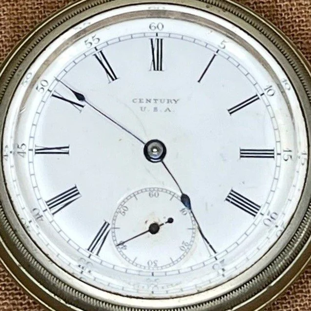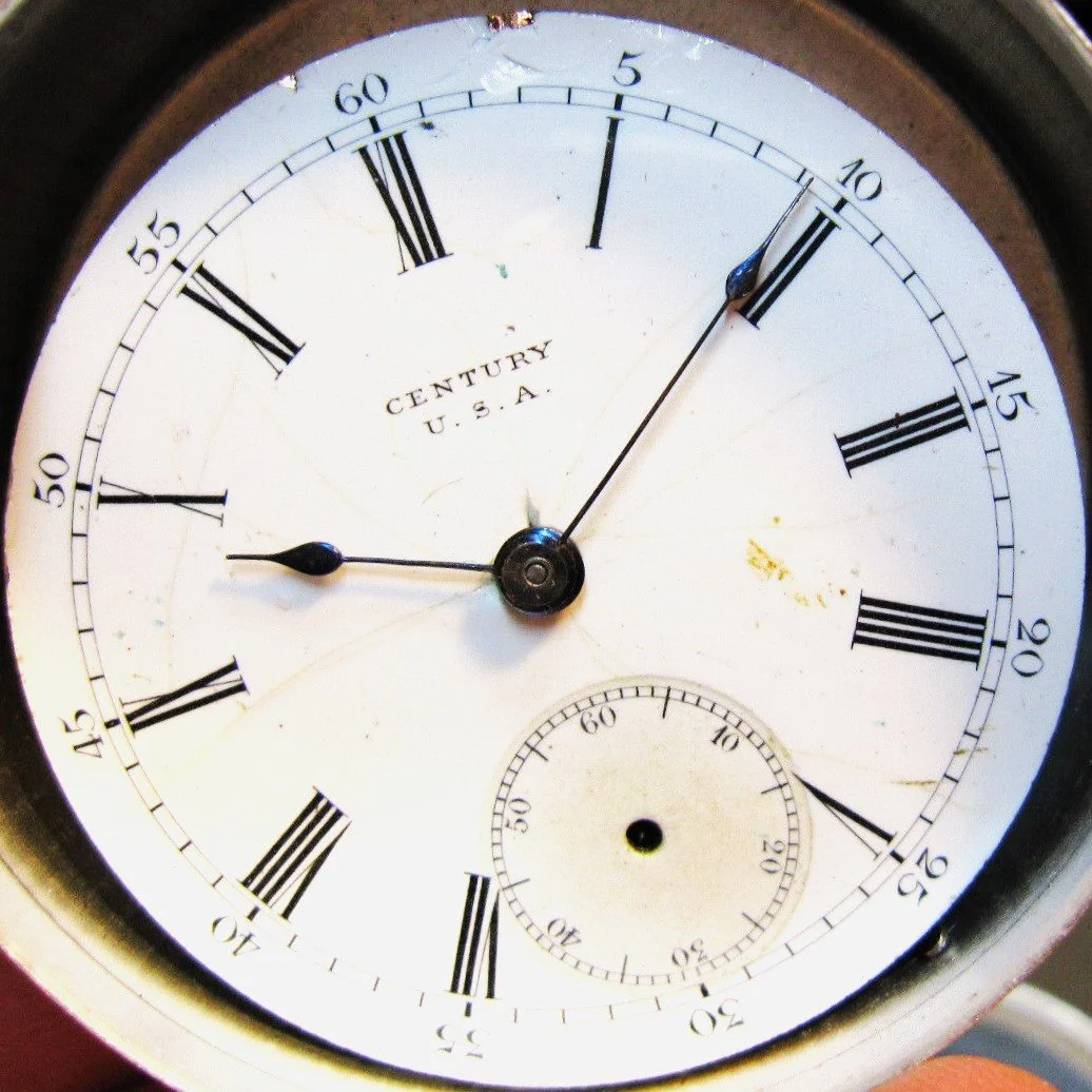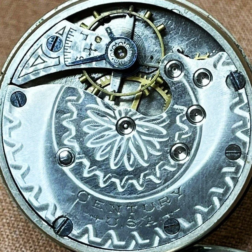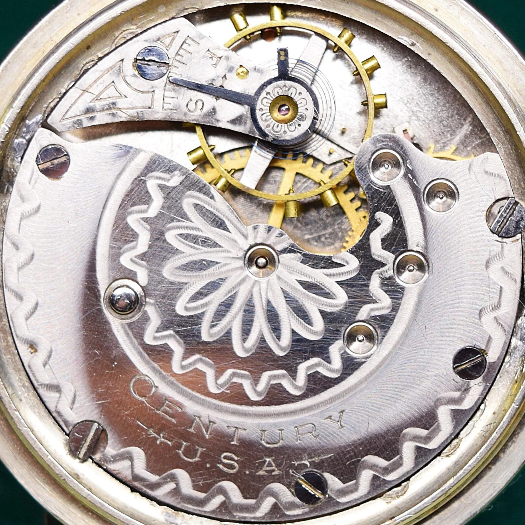 The movement presents with an 18-size private label "CENTURY U.S.A." #1254 Roman dial with a ring minute track and black five-minute marginals; fitted with Seth Thomas #1281 blued spade hands 18-size. Century U.S.A. is a Seth Thomas Named Grade in Seth Thomas Model 10, Model 11, Model 12, Model 13, Model 18, and Model 24 used as a trade name on pocket watch movements manufactured for Sears, Roebuck & Co. by Seth Thomas Watch Co.