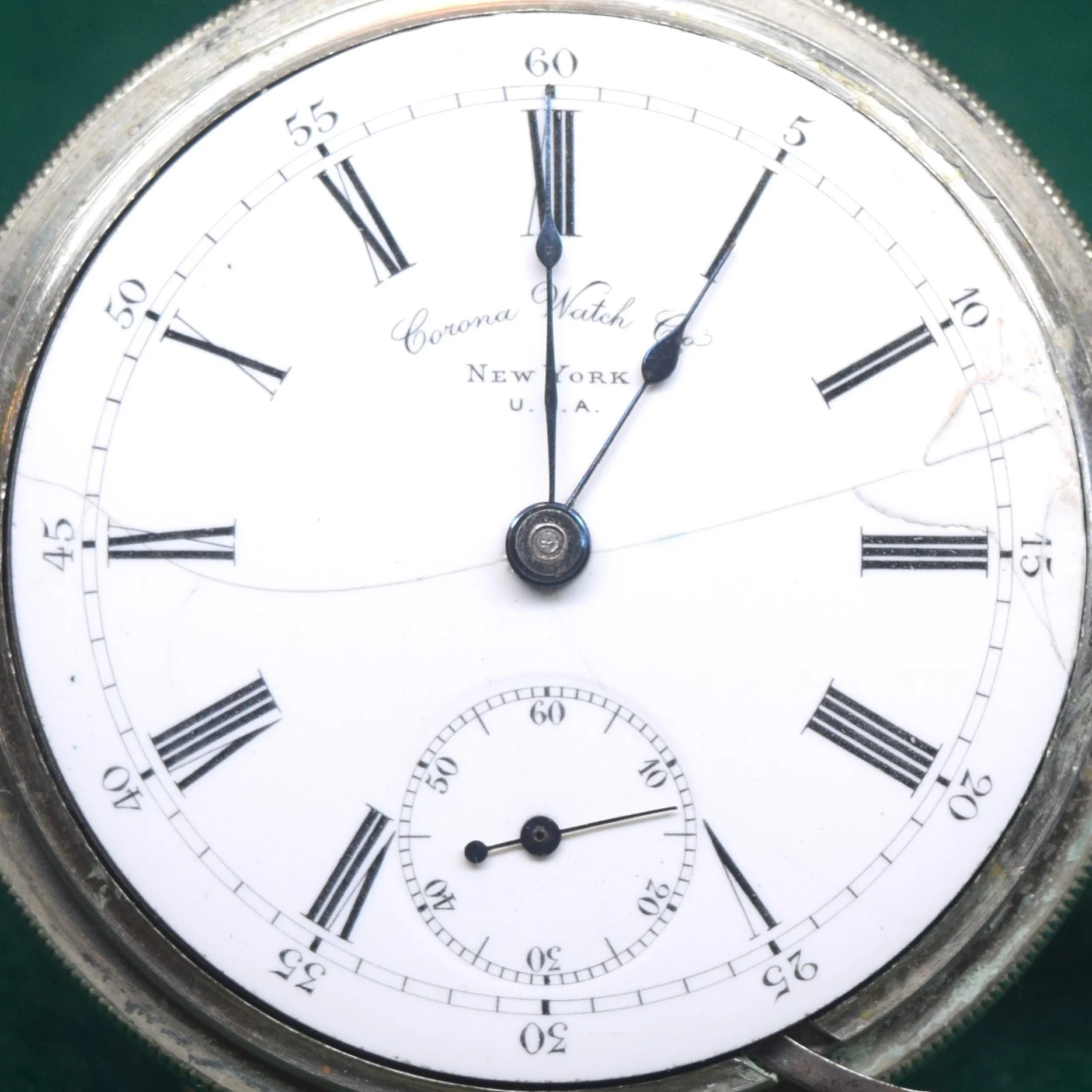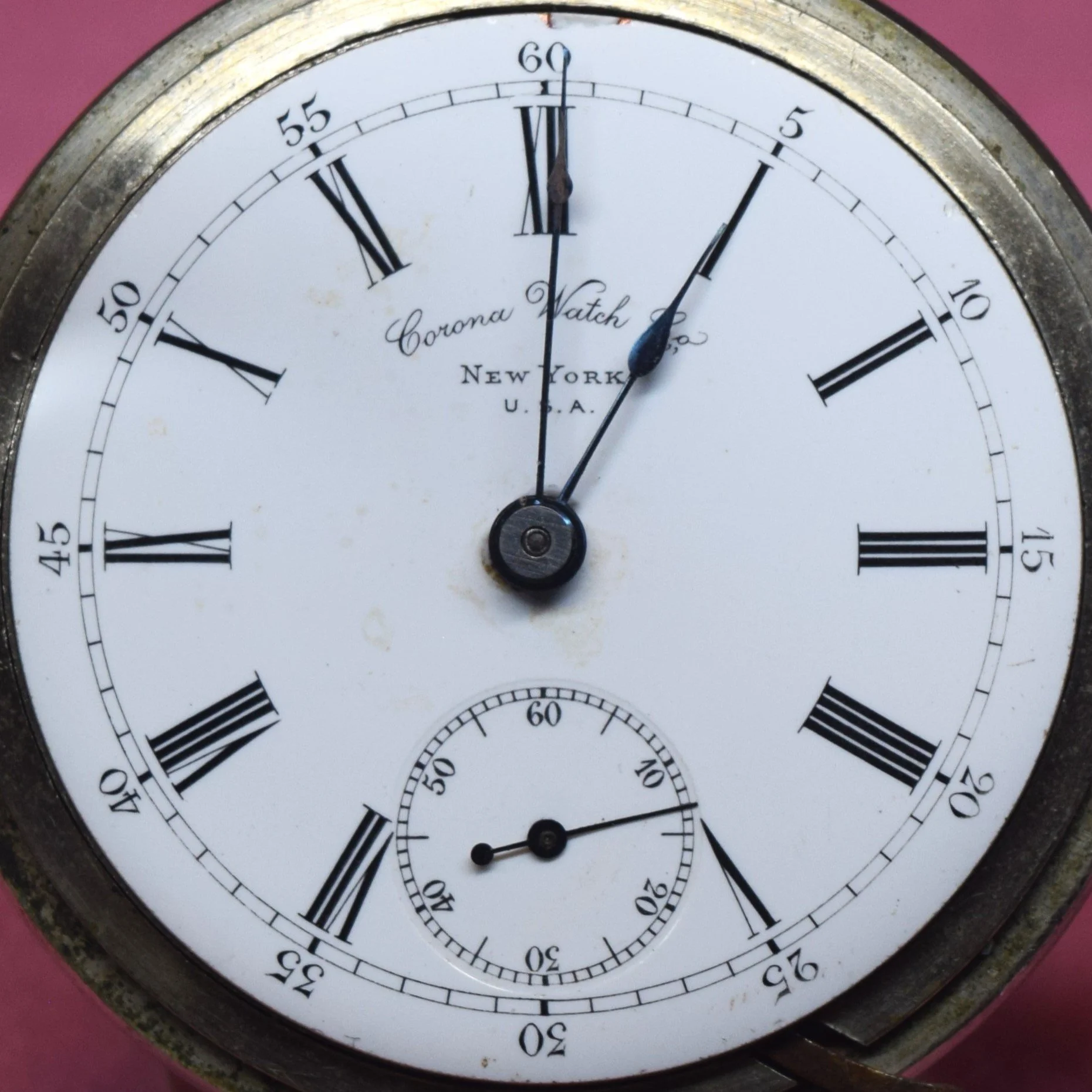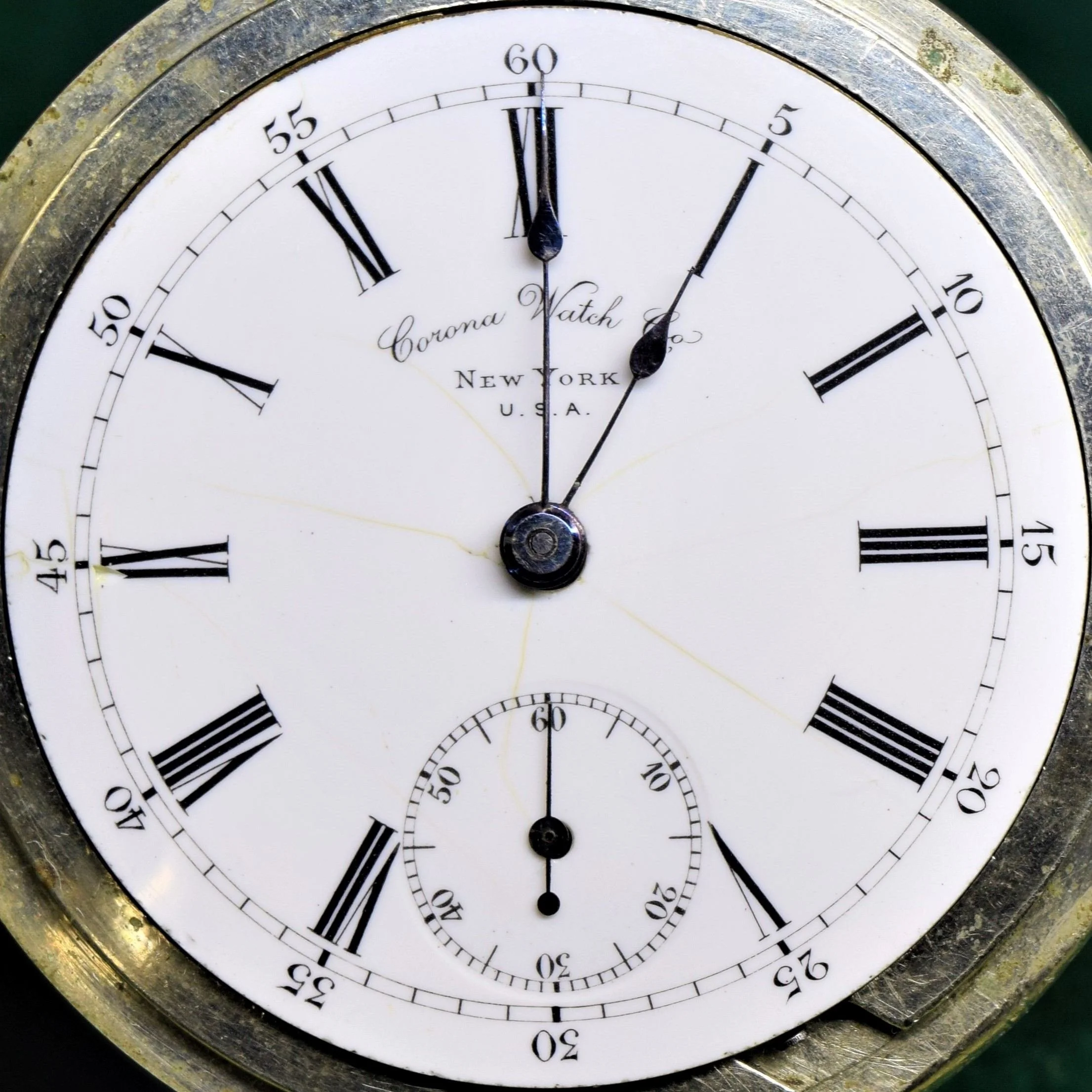 The movement presents with an 18-size private label "Corona Watch Co. NEW YORK U.S.A." #1254 Roman dial with a ring minute track and black five-minute marginals; fitted with Seth Thomas #1281 blued spade hands 18-size. Corona Watch Co. is a private label in Seth Thomas Model 12 and Model 13. Corona Watch Co. was used as a trade name on pocket watch movements manufactured for R.R. Fogel & Co. by Seth Thomas Watch Co.