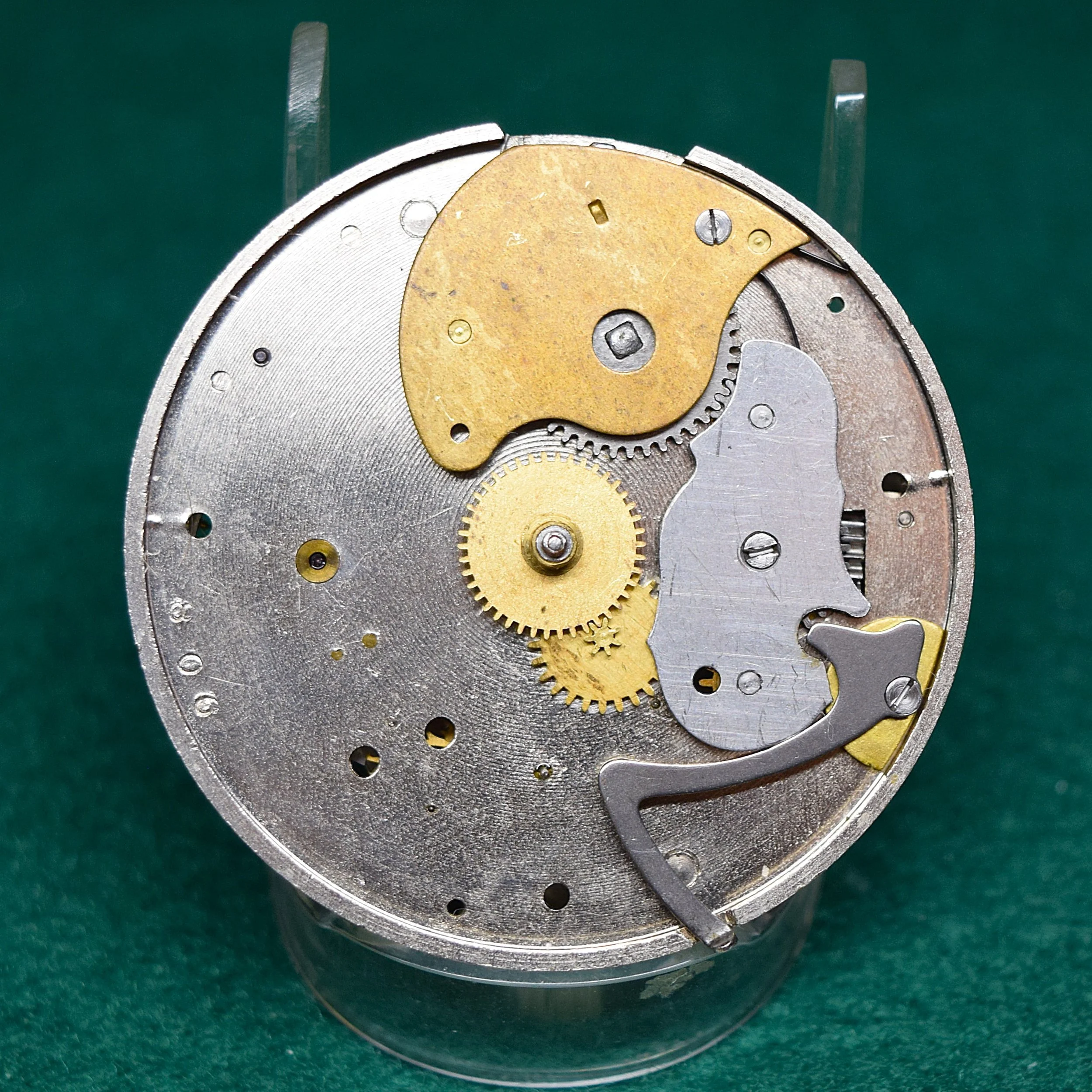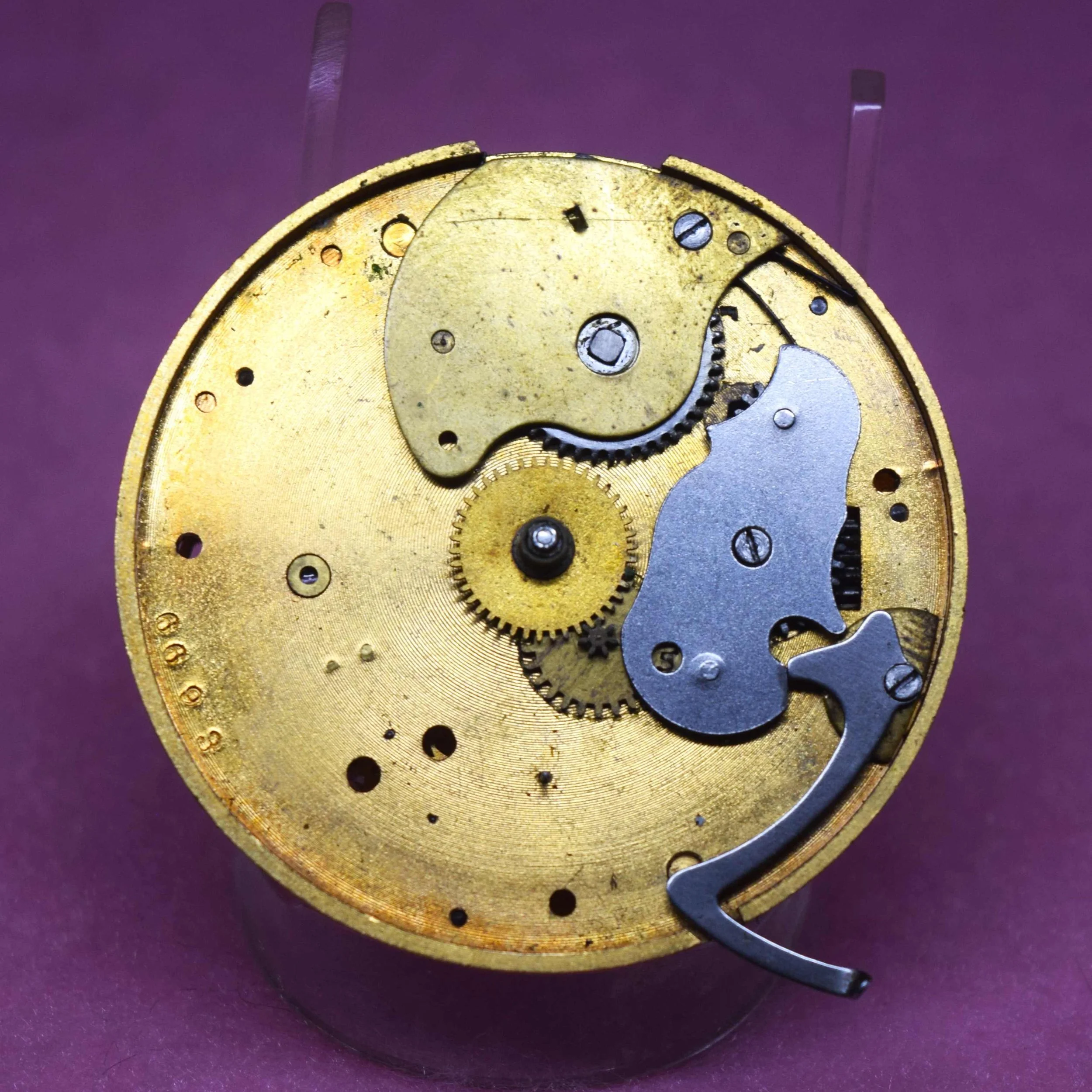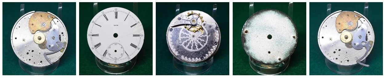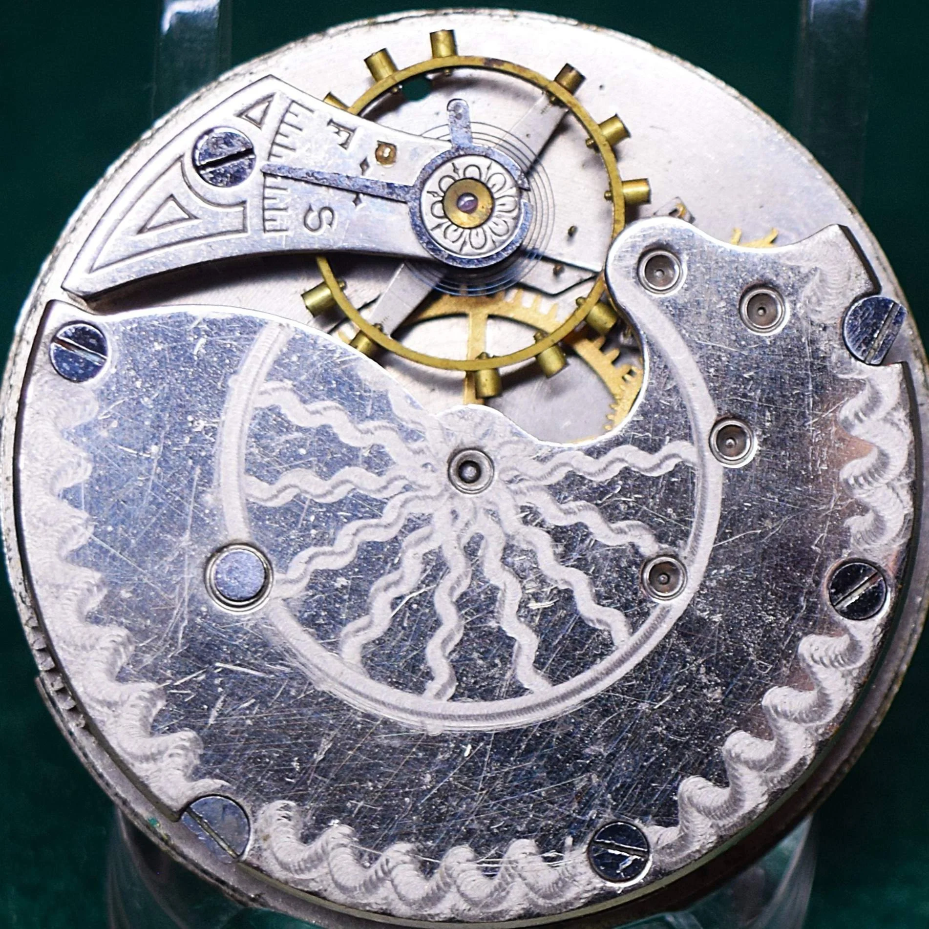The movement is temporarily cased in an 18-size Fahys Watch Case Company open-face Oresilver No 1 (nickel) pocket watch case with screw back and bezel, serial number 338512 for photographic purposes only.