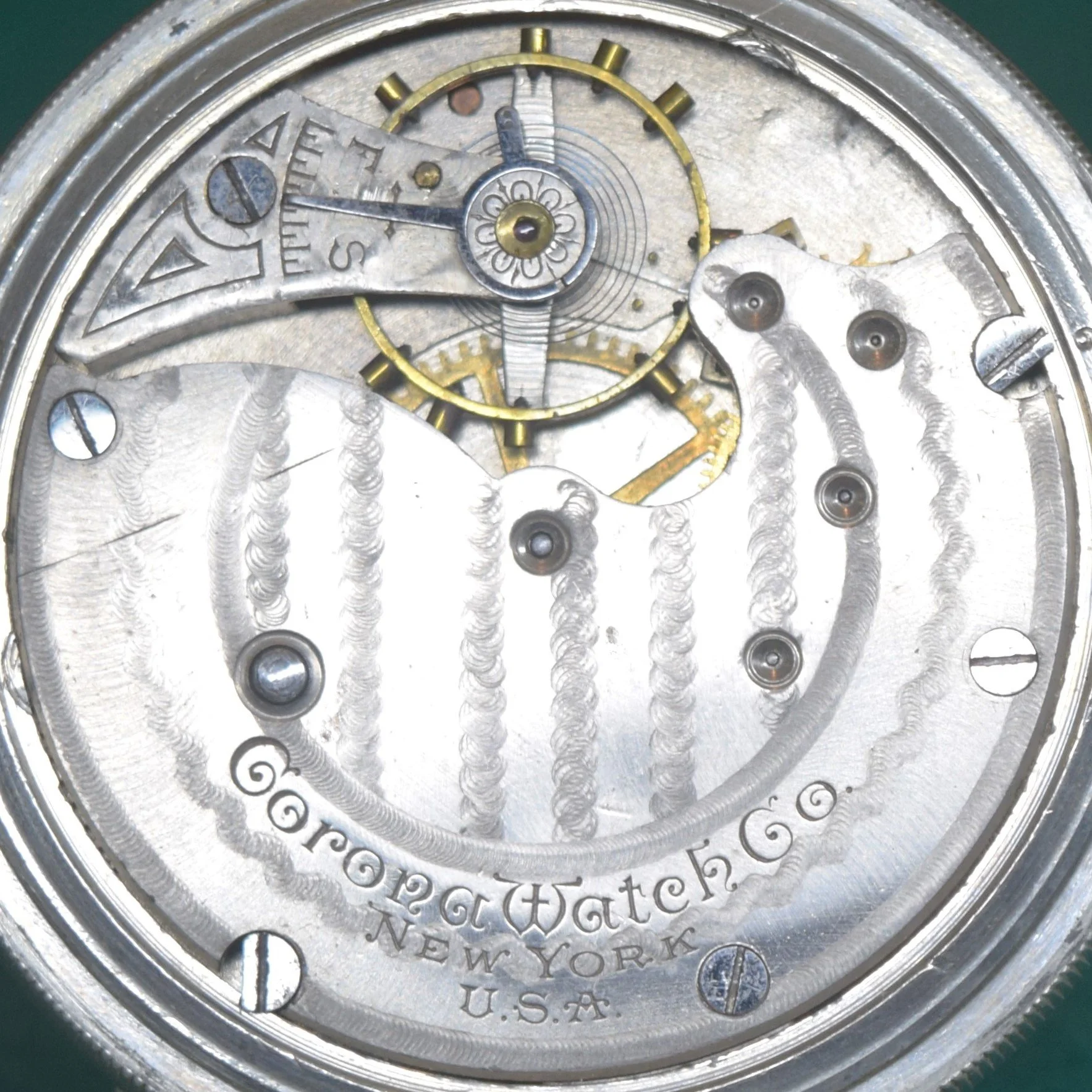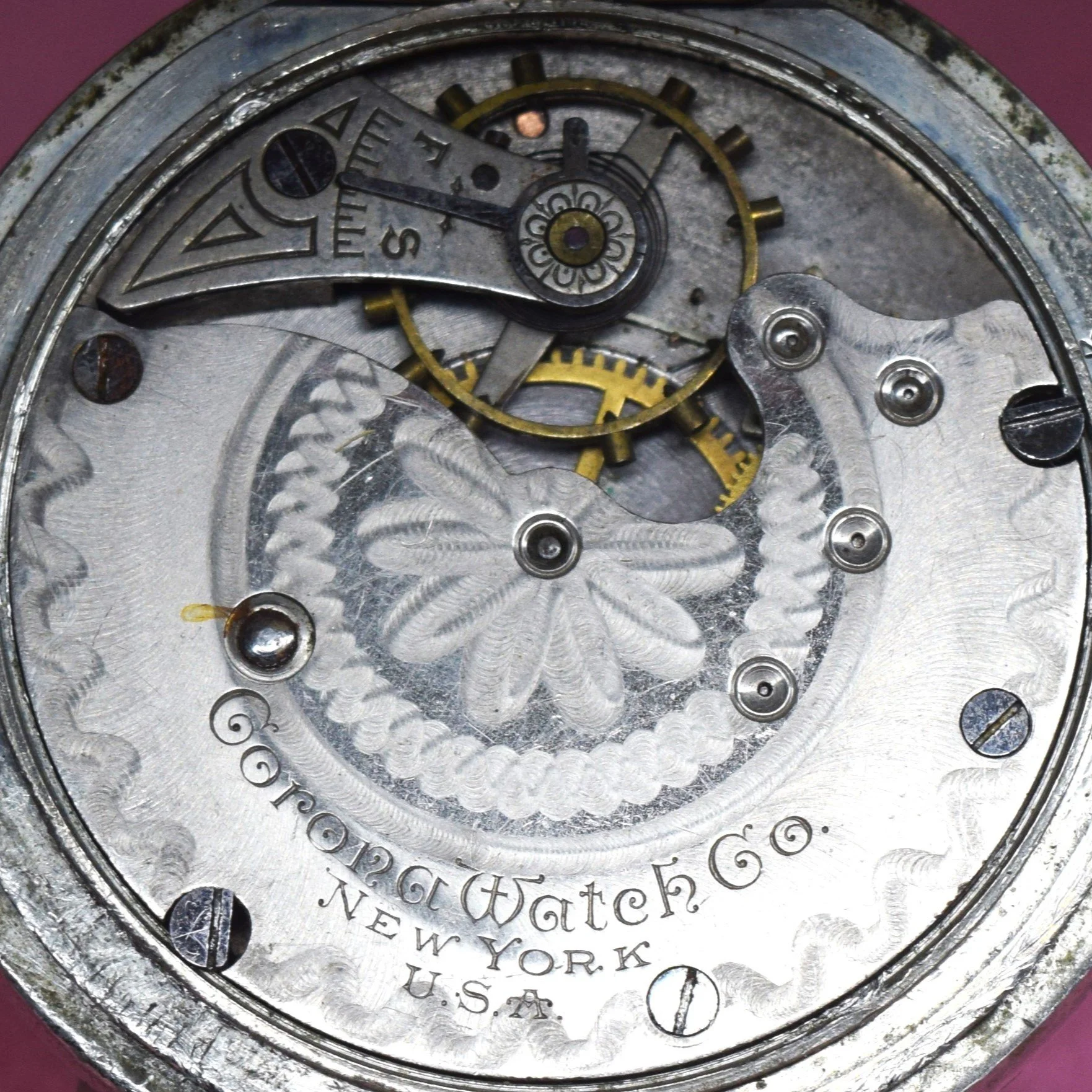 This 1898-1904 Seth Thomas 18-size hunting Model 13 pocket watch was manufactured with a nickel finished 3/4 plate, 7 jewels, and it is non-adjusted. The movement is stem wound and lever set, with a flat hair spring and plain/simple regulator. Its SETH THOMAS FAN Serial Number is CORONA13B, and its grade is Seth Thomas named grade Century. The private label movement is signed “Corona Watch Co. NEW YORK U.S.A.”.