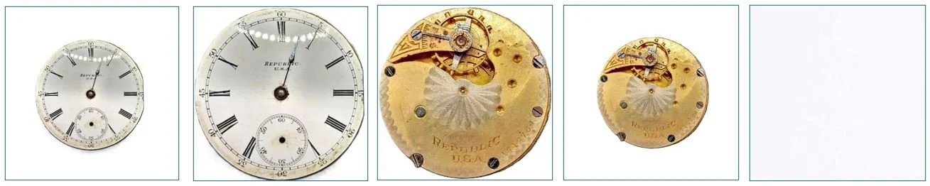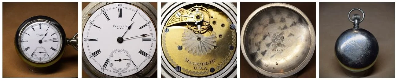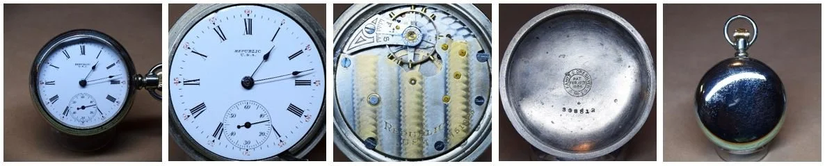The movement presents with an 18-size private label "REPUBLIC U.S.A." Arabic Metal on Porcelain Cartouche dial with a dots minute track and no marginals; fitted with Seth Thomas #1287 Fancy Louis XIV gilt hands 18-size. Corona Watch Co. is a private label in Seth Thomas Model 12 and Model 13. REPUBLIC U.S.A. is a private label in Seth Thomas Model 12, Model 13, Model 18, Model 19, and Model 24 used as a trade name on pocket watch movements manufactured for Illinois Watch Case Company.