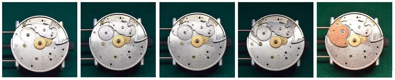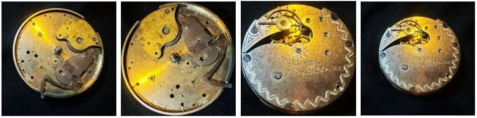The ratchet assembly was missing from this movement when I acquired it; so that needed to be replaced in order to wind the pocket watch. Fortunately, these components are seldom missing from parts movements; so it was not difficult to find good original Model 13 material for this restoration.
