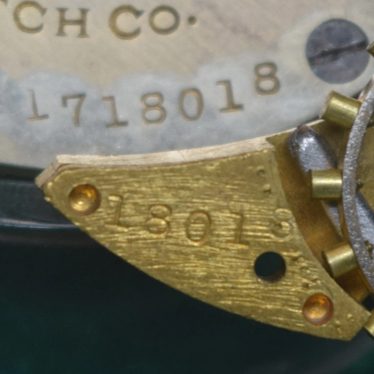The movement presents with an 18-size private label "SENTINEL U.S.A." Roman dial with a ring minute track and red five-minute marginals; fitted with Seth Thomas #1281 blued spade hands 18-size. SENTINEL U.S.A. is a Seth Thomas Named Grade in Seth Thomas Model 12, Model 13, and Model 18 manufactured for Sears, Roebuck & Co. by Seth Thomas Watch Co. The movement on this “Trading Watch” is marked “23 Jewels Adjusted” but it has only 7 jewels and is non-adjusted. Red beads are held in place over the pivots to simulate extra jewels.