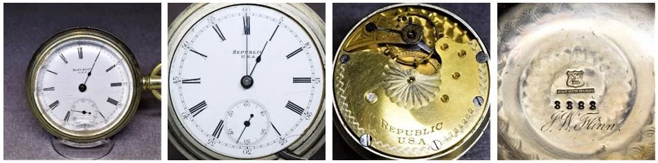 This 1898-1904 Seth Thomas 18-size hunting Model 13 pocket watch was manufactured with a two-tone finished 3/4 plate, 7 jewels, and it is non-adjusted. The movement is stem wound and lever set, with a flat hair spring and plain/simple regulator. Its SETH THOMAS FAN Serial Number is REPUBLIC13A, and its grade is Seth Thomas named grade Century. The private label movement is signed “REPUBLIC U.S.A.”.