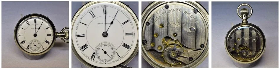 This 1904 Seth Thomas 18-size hunting Model 13 pocket watch was manufactured with a nickel finished 3/4 plate, 7 jewels, and it is non-adjusted. The movement is stem wound and lever set, with a flat hair spring and plain/simple regulator. Its Serial Number is 1750408, and its grade is Seth Thomas named grade Century. The private label movement is signed “Knickerbocker Watch Co. NEW YORK”.