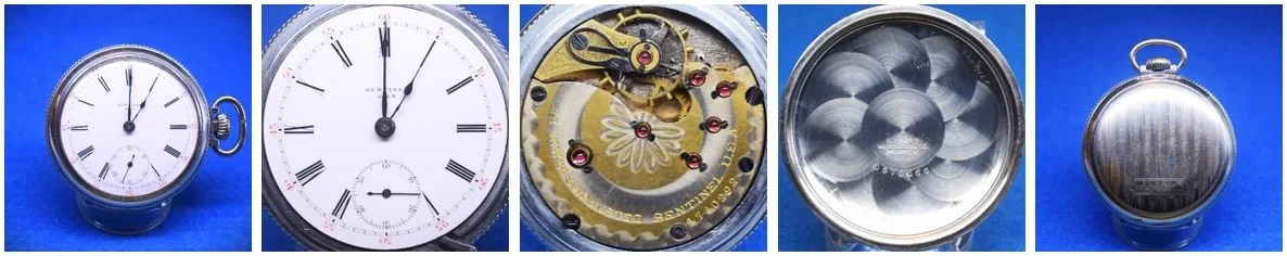 This 1904 Seth Thomas 18-size hunting Model 13 pocket watch was manufactured with a two-tone finished 3/4 plate, 7 jewels, and it is non-adjusted. The movement is stem wound and lever set, with a flat hair spring and micrometric regulator. Red beads are held in place over the pivots to simulate extra jewels. Its Serial Number is 1740292, and its grade is Seth Thomas named grade Century. The private label movement is signed “SENTINEL U.S.A.”.