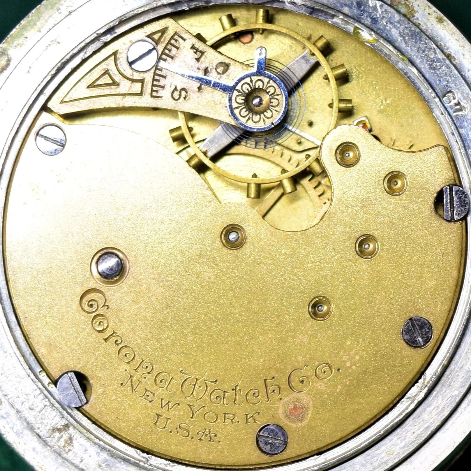 The movement is temporarily cased in an 18-size Fahys Watch Company Oresilver No. 1 (nickel) open-face pocket watch case with screw back and bezel, serial number 338512.