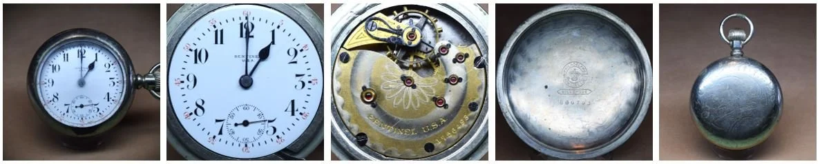 The movement presents with an 18-size private label "SENTINEL U.S.A." Roman dial with a ring minute track and red five-minute marginals; fitted with Seth Thomas #1282 blued spade & whip Railroad hands 18-size. SENTINEL U.S.A. is a Seth Thomas Named Grade in Seth Thomas Model 12, Model 13, and Model 18 manufactured for Sears, Roebuck & Co. by Seth Thomas Watch Co. The movement on this “Trading Watch” is marked “23 Jewels Adjusted” but it has only 7 jewels and is non-adjusted. Red beads are held in place over the pivots to simulate extra jewels.