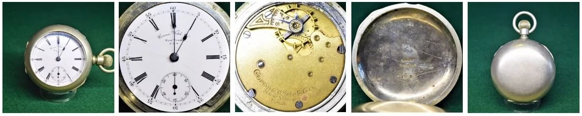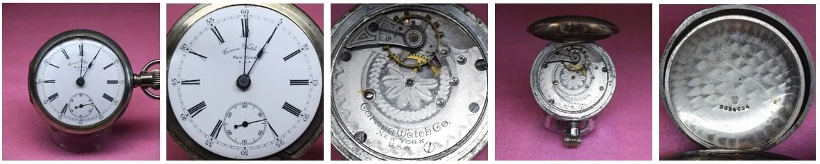 This 1898-1904 Seth Thomas 18-size hunting Model 13 pocket watch was manufactured with a nickel finished 3/4 plate, 7 jewels, and it is non-adjusted. The movement is stem wound and lever set, with a flat hair spring and plain/simple regulator. Its SETH THOMAS FAN Serial Number is CORONA13C, and its grade is Seth Thomas named grade Century. The private label movement is signed “Corona Watch Co. NEW YORK U.S.A.”.
