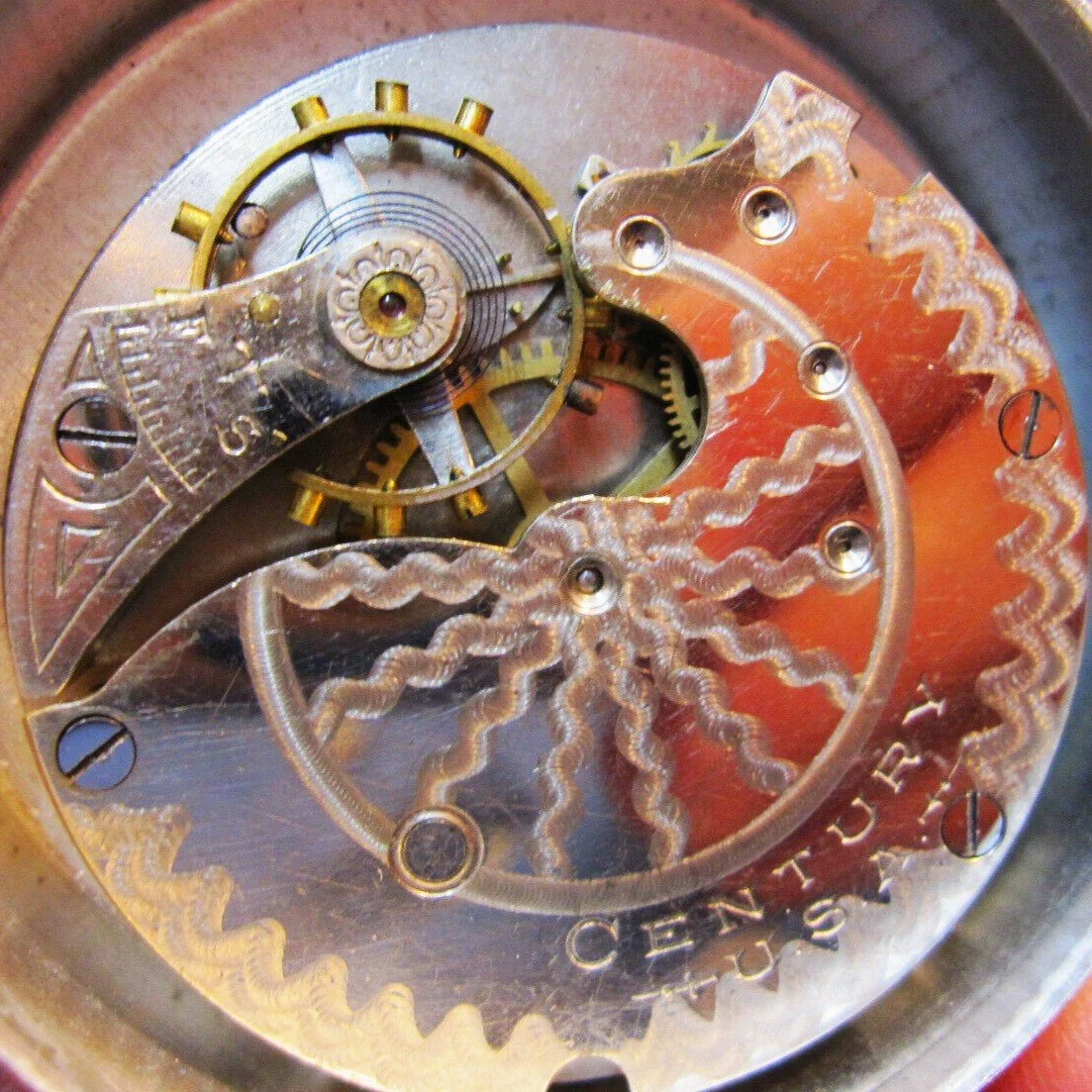This 1898-1904 Seth Thomas 18-size hunting Model 13 pocket watch was manufactured with a nickel finished 3/4 plate, 7 jewels, and it is non-adjusted. The movement is stem wound and lever set, with a flat hair spring and plain/simple regulator. Its SETH THOMAS FAN Serial Number is CENTURY13D, and its grade is Seth Thomas named grade Century. The movement is signed “CENTURY U.S.A.”.
