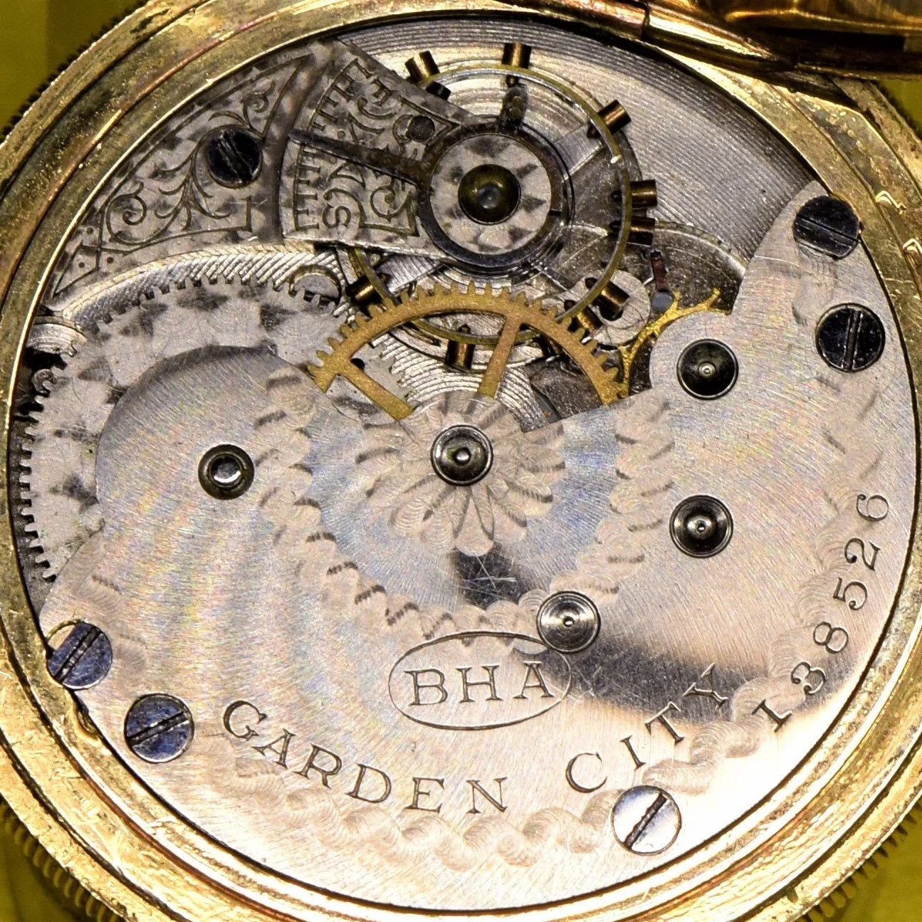 Seth Thomas produced the Garden City pocket watch for the Chicago based jewelry wholesaler Lapp & Flershem. The engraved initials, BHA, in an oval represents the Lapp & Flershem trademark and logo “Busiest House in America”. Chicago Illinois is the “Garden City”.