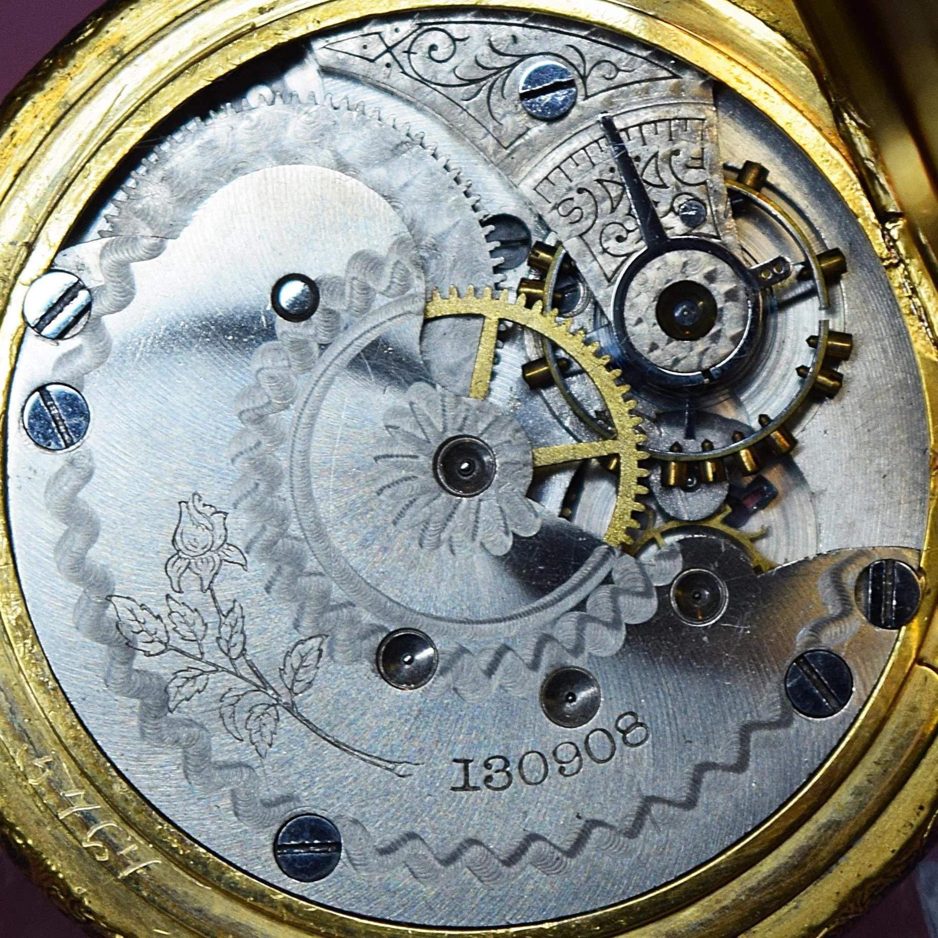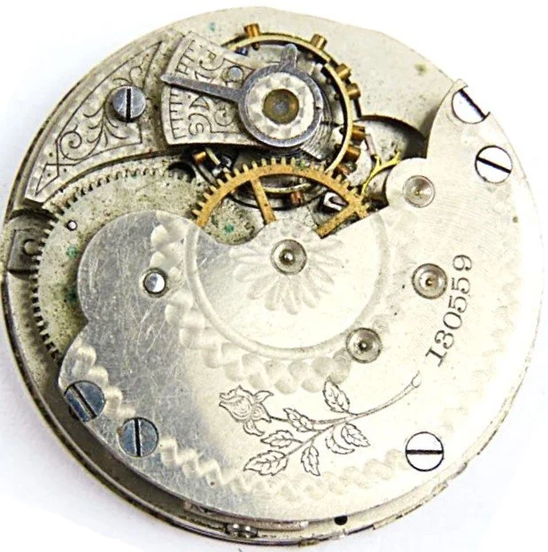 This 1893 Seth Thomas 6-size hunting Model 15 pocket watch was manufactured with a nickel finished 3/4 plate, 7 jewels, and it is non-adjusted. The movement is stem wound and lever set, with a flat hair spring, and plain/simple regulator. Its serial number is 130559, and its grade is Seth Thomas numbered grade 5. The private label movement is engraved with the image of a long-stem rose as its signature. This is the 2,558th Seth Thomas Model 15 pocket watch produced. Model 15 serial numbers started at 128001 and concluded at 160000.