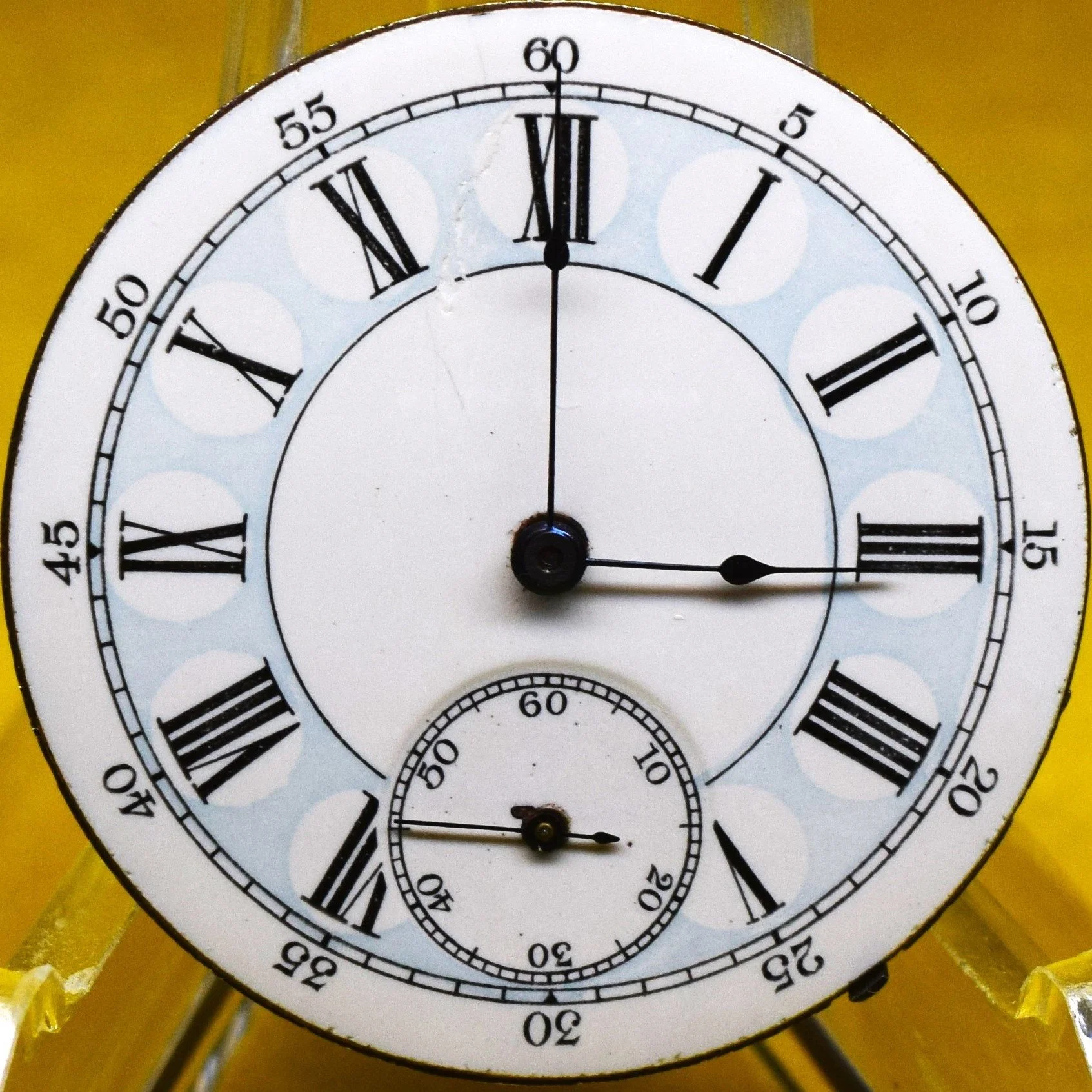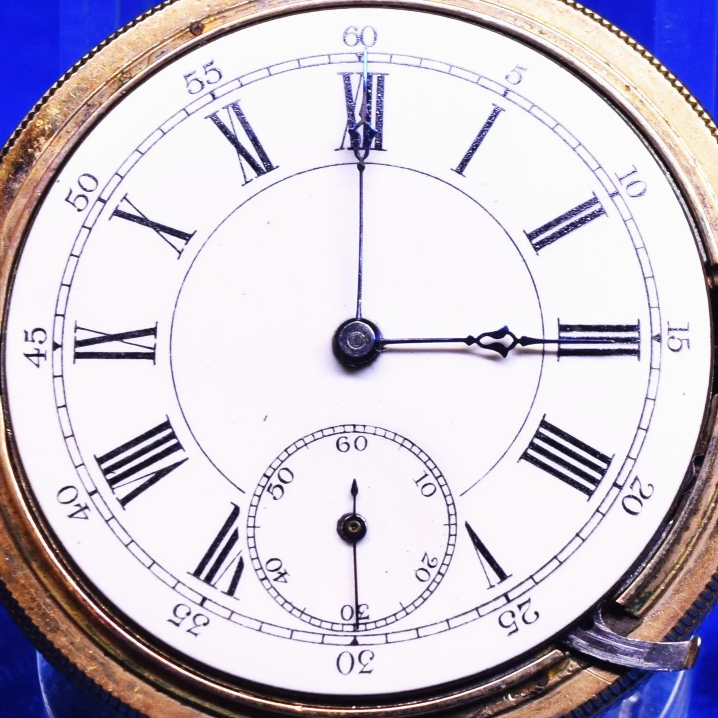 The movement presents with a 6-size unbranded private label Garden City Blue Roman Fancy Dial with a ring minute track and black five-minute marginals, fitted with Seth Thomas Open Morning Glory hands 6-size.