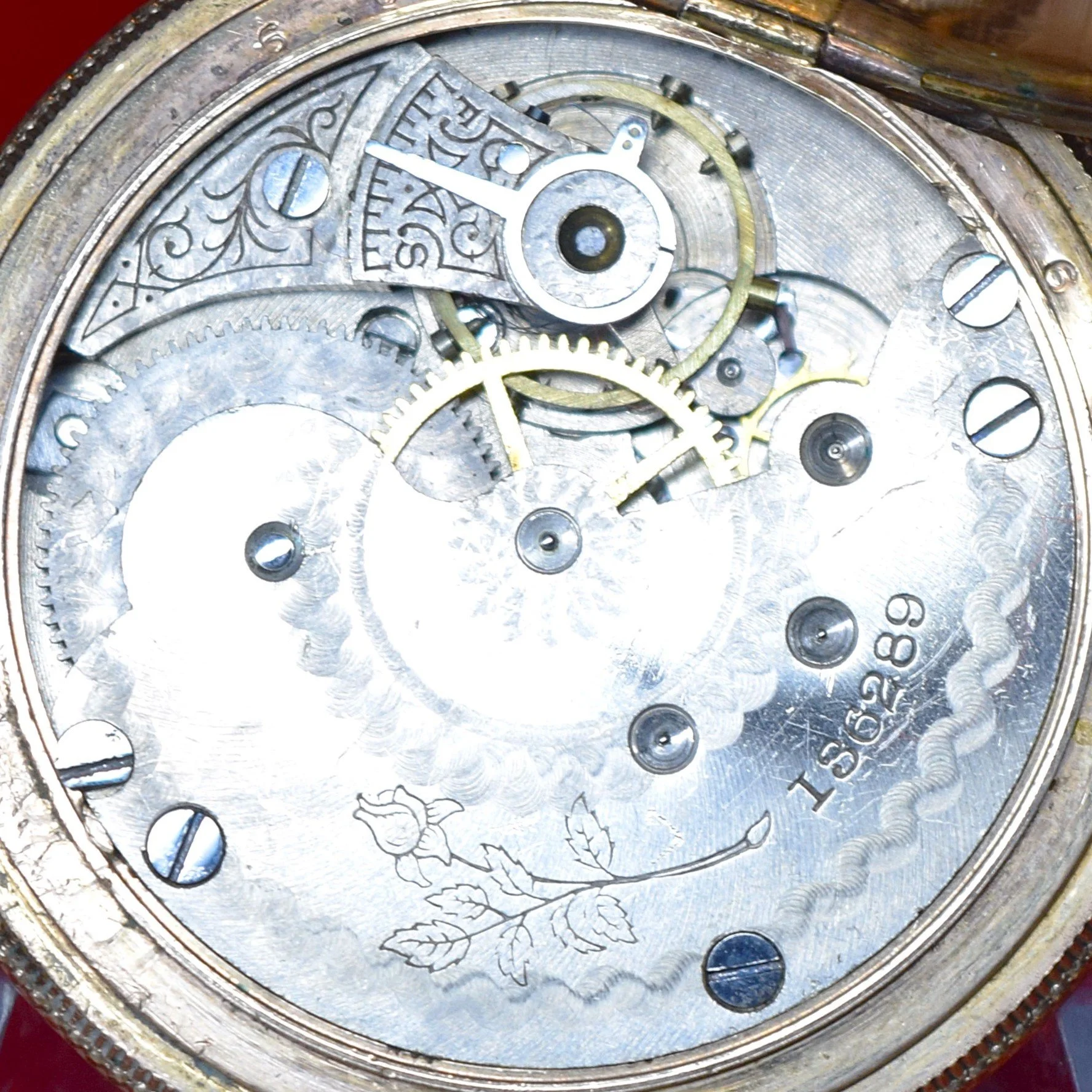 This 1893 Seth Thomas 6-size hunting Model 15 pocket watch was manufactured with a nickel finished 3/4 plate, 7 jewels, and it is non-adjusted. The movement is stem wound and lever set, with a flat hair spring, and plain/simple regulator. Its serial number is 136289, and its grade is Seth Thomas numbered grade 5. The private label movement is engraved with the image of a long stem rose as its signature.