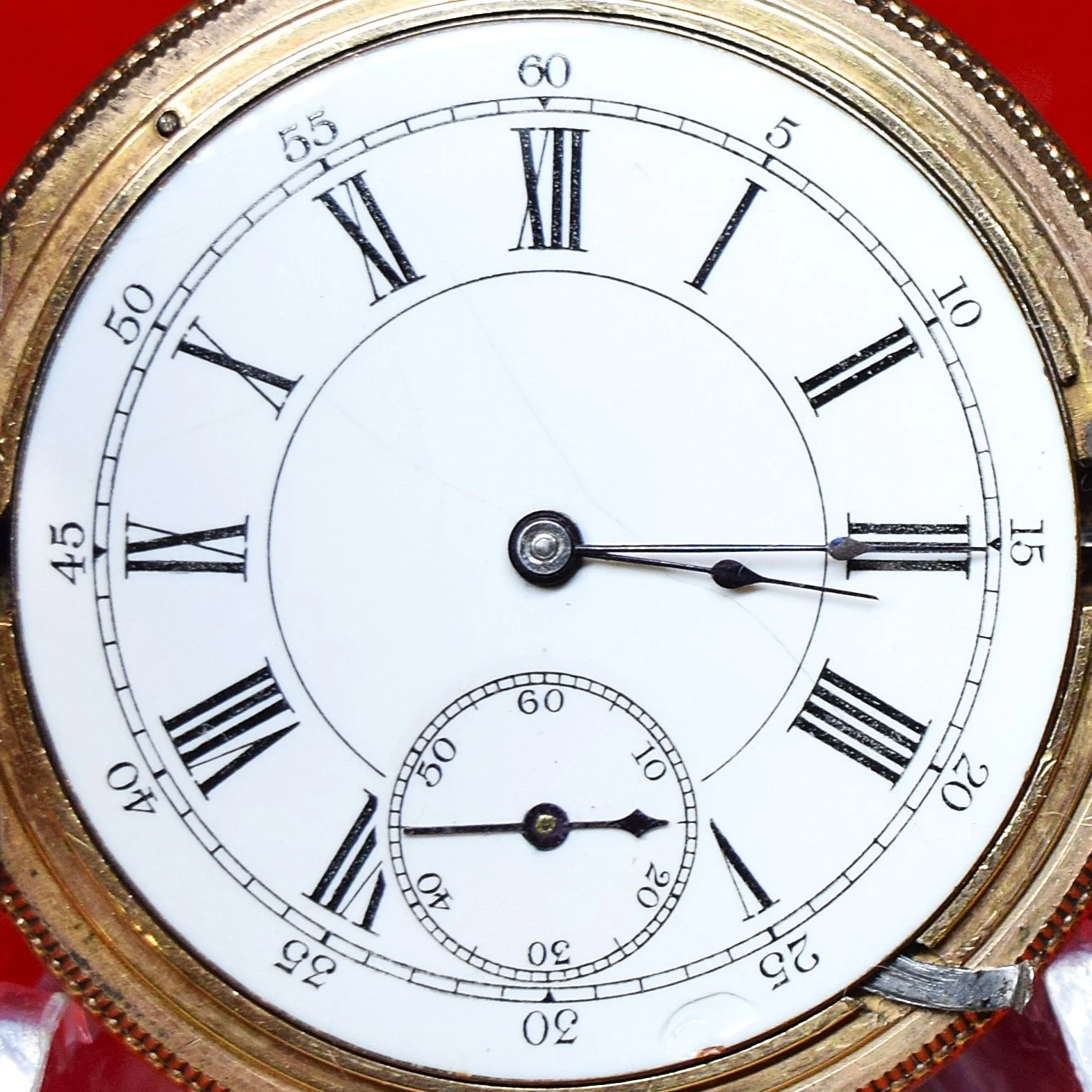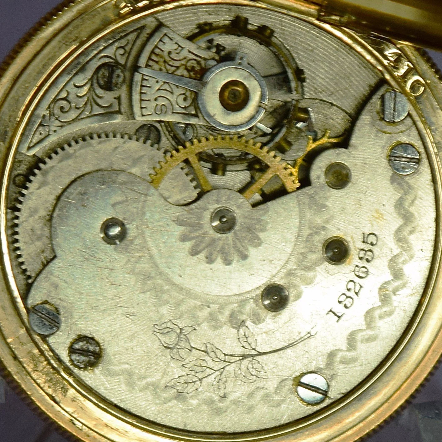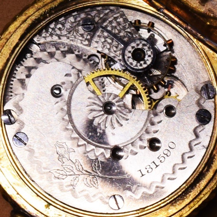 The movement is temporarily cased in a 6-size H. Muhrs Sons 14k 10-year gold-filled Lion hunting pocket watch case, serial number 228410, for photographic purposes only.