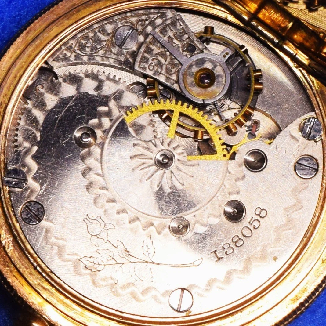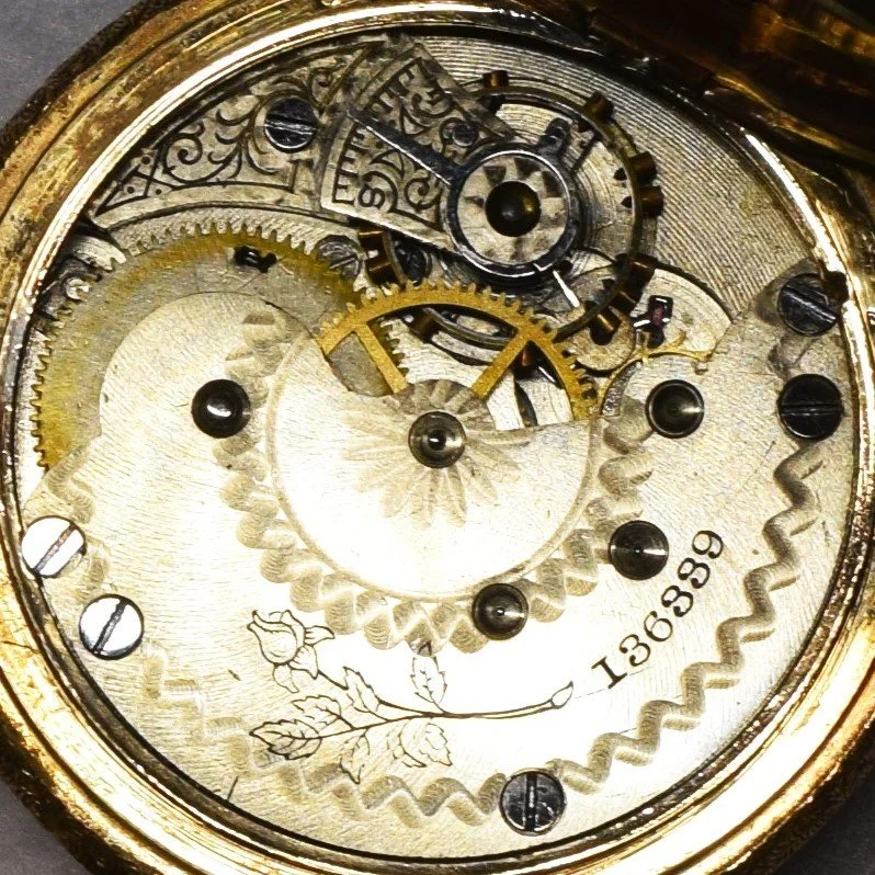 The movement is cased in a 6-size Philadelphia Watch Case Company, gold-filled Victory hunting watch case with floral engraving on front and back covers, serial number 4138349.