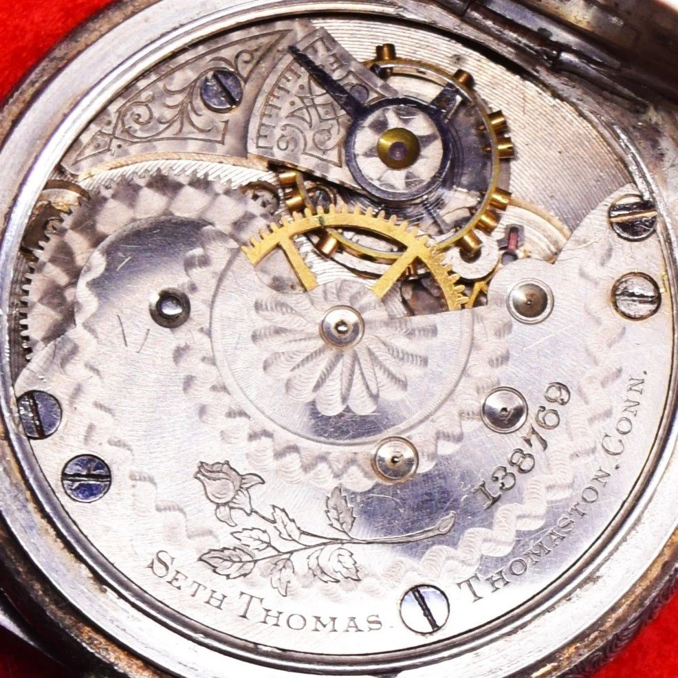 This 1893 Seth Thomas 6-size hunting Model 15 pocket watch was manufactured with a nickel finished 3/4 plate, 7 jewels, and it is non-adjusted. The movement is stem wound and lever set, with a flat hair spring, and plain/simple regulator. Its serial number is 131590, and its grade is Seth Thomas numbered grade 5. The private label movement is engraved with the image of a long stem rose as its signature.