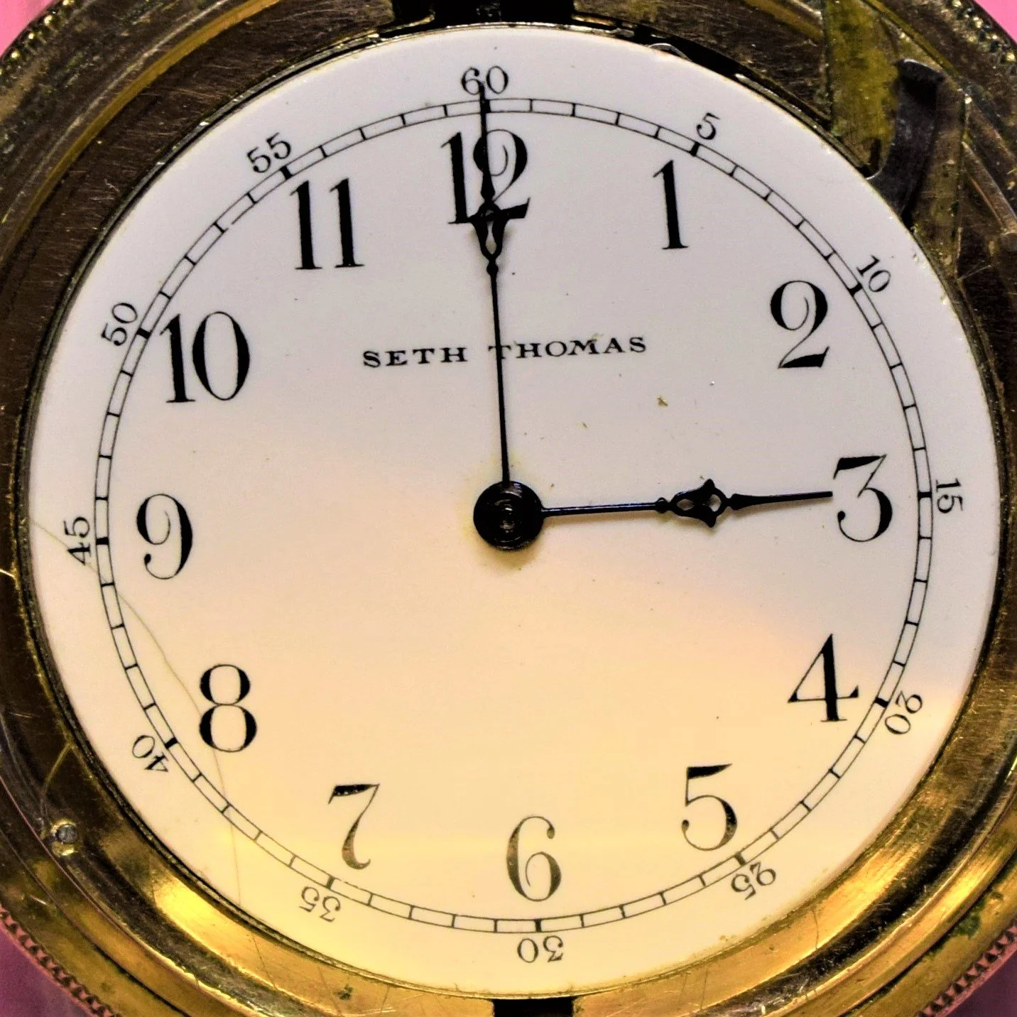 At time of purchase a "SETH THOMAS" signature appeared to have been added by a previous owner, possibly through use of a decal. It was not precisely drawn and was showing signs of deterioration. It wiped away when the dial was cleaned with soapy water.