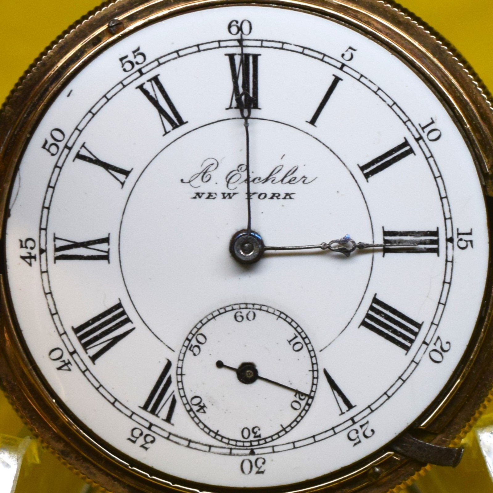 The movement presents with a 6-size private label A. Eichler New York Roman dial with ring minute track and black five-minute marginals; fitted with Seth Thomas #1271 blued spade hands 6-size.