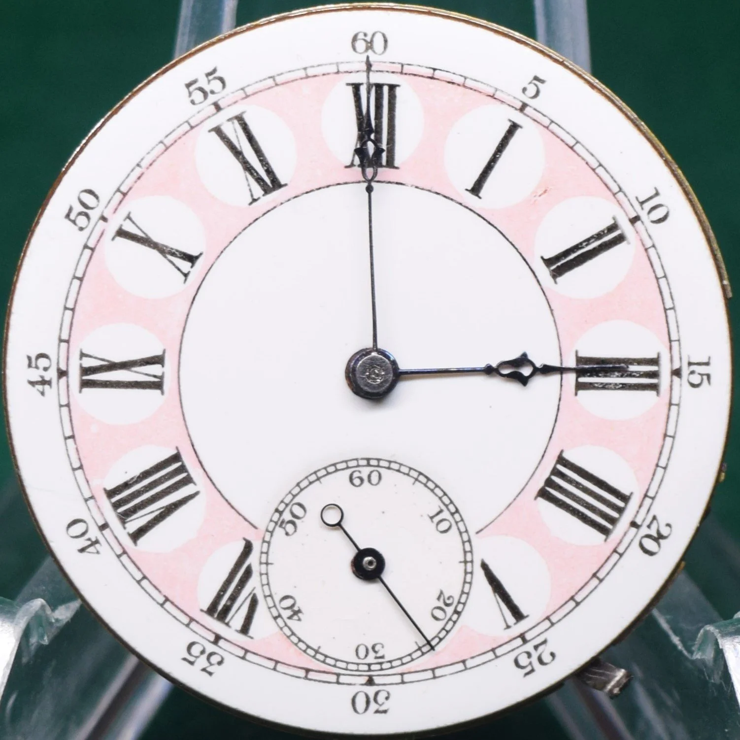 The movement presents with a 6-size unbranded private label Garden City Pink Roman Fancy Dial with a ring minute track and black five-minute marginals, fitted with Seth Thomas Open Morning Glory hands 6-size.