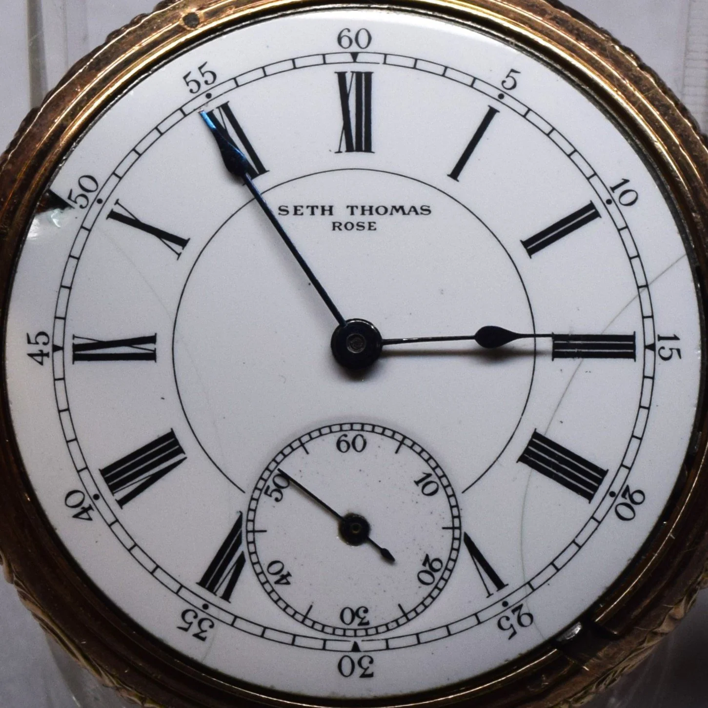 The movement presents with a 6-size "Seth Thomas Rose" private label Roman dial with a ring minute track and black five-minute marginals, fitted with Seth Thomas #1271 blued spade hands 6-size.