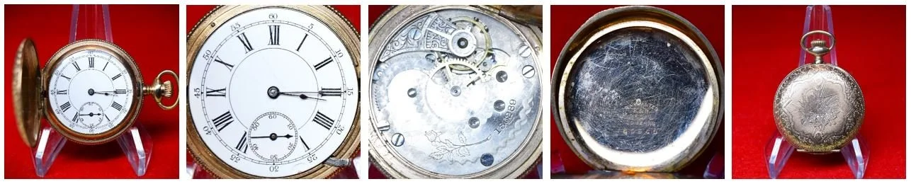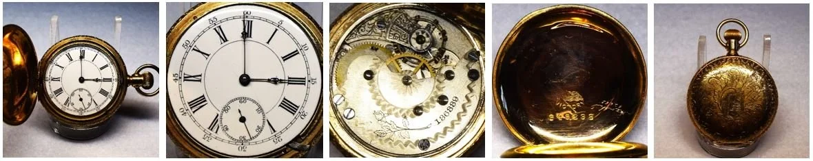The movement is presently cased in a 6-size H. Muhrs Sons, gold-filled Victory hunting pocket watch case, serial number 646238.