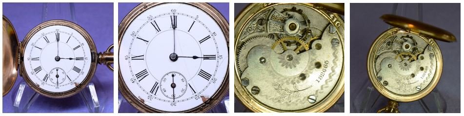The movement is presently cased in a 6-size H. Muhrs Sons gold filled Lion hunting watch case, serial number 228410, for photographic purposes only.