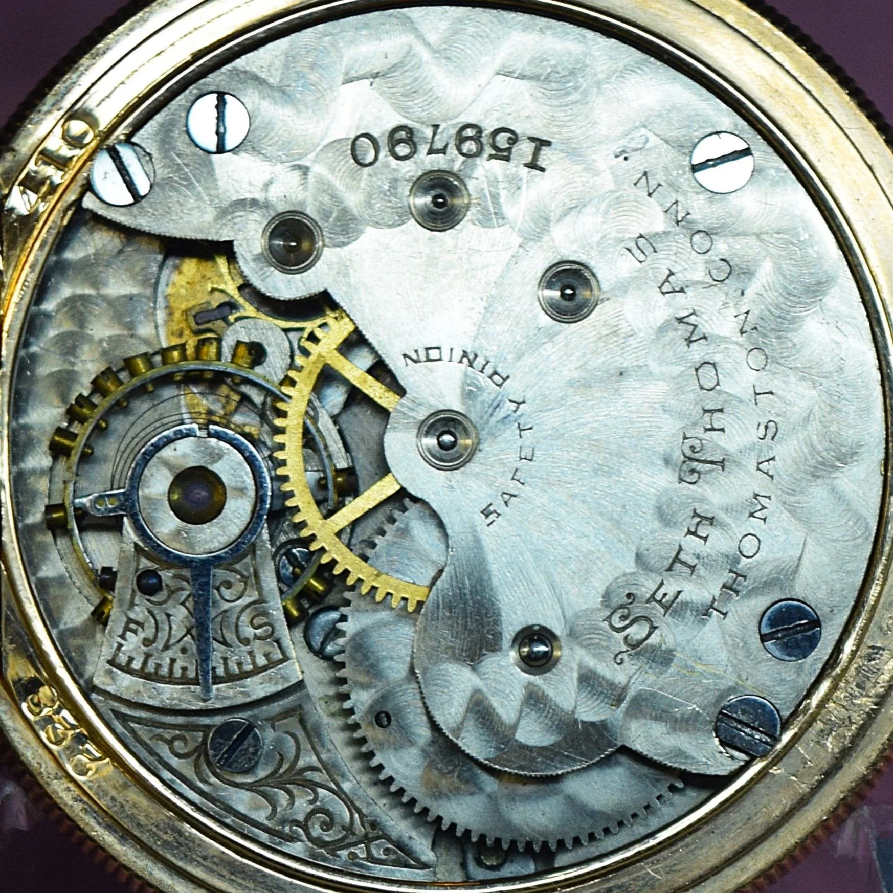 This 1899 Seth Thomas 6-size hunting Model 15 pocket watch was manufactured with a two-tone finished 3/4 plate, 7 jewels, and it is non-adjusted. The movement is stem wound and lever set, with a flat hair spring, and plain/simple regulator. Its serial number is 157080, and its grade is Seth Thomas numbered grade 5. The movement is signed Seth Thomas Thomaston Conn.