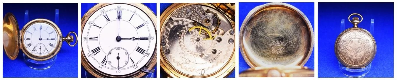 The movement is presently cased in a 6-size Philadelphia Watch Case Company, gold-filled Boss Scale Crown hunting pocket watch case, serial number 98593.