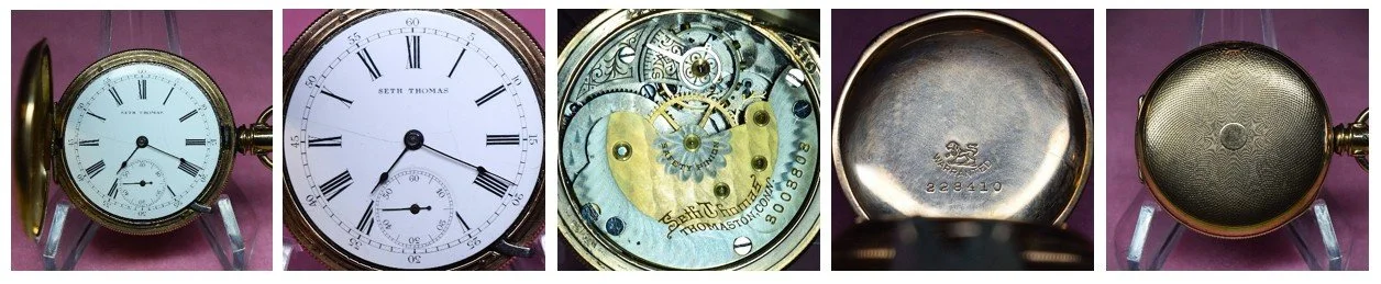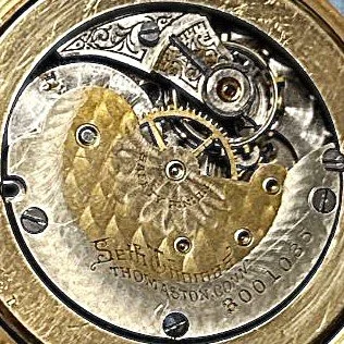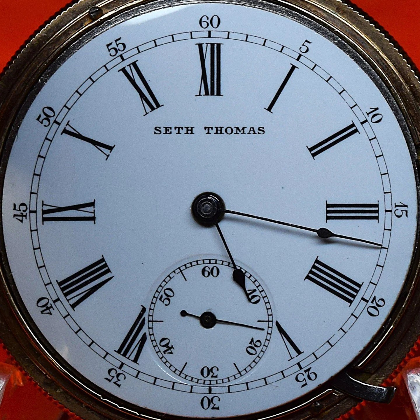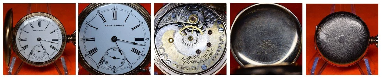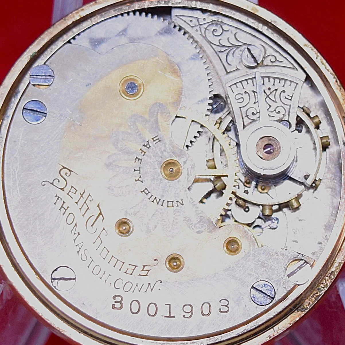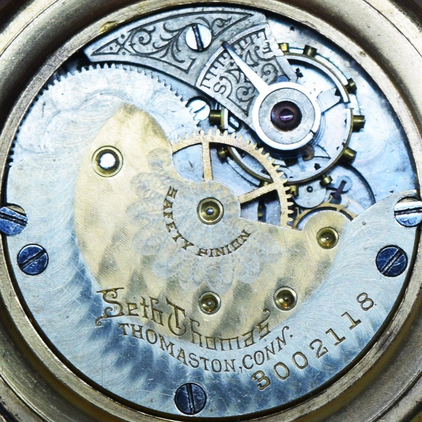 This 1912 Seth Thomas 6-size hunting Model 19 pocket watch was manufactured with a two-tone finished 3/4 plate, 7 jewels, and it is non-adjusted. The movement is stem wound and pendant set, with a Breguet hair spring, and plain/simple regulator. Its serial number is 3003803, and its grade is Seth Thomas numbered grade 35. The movement is signed “Seth Thomas Thomaston, Conn.”.