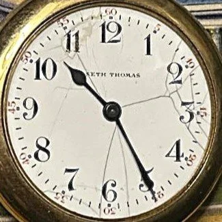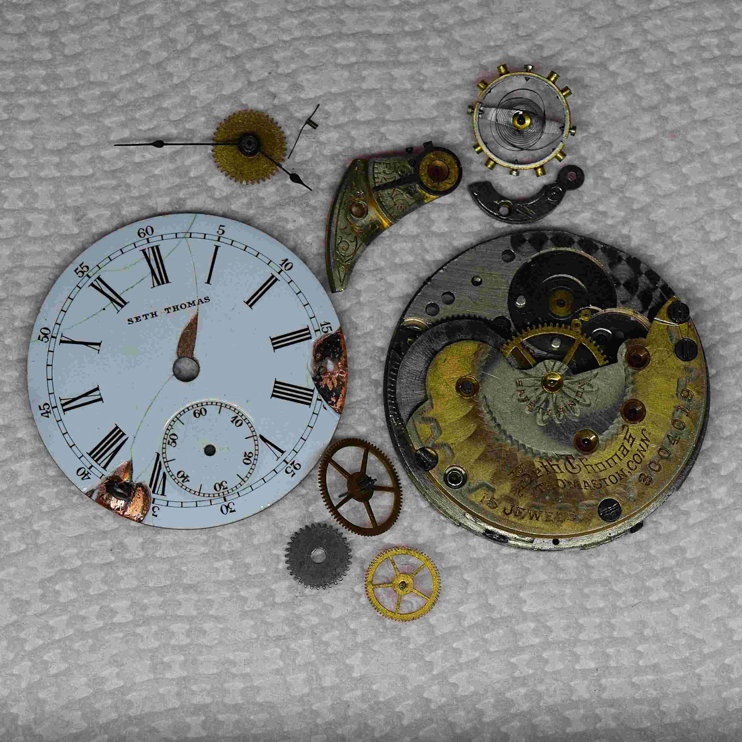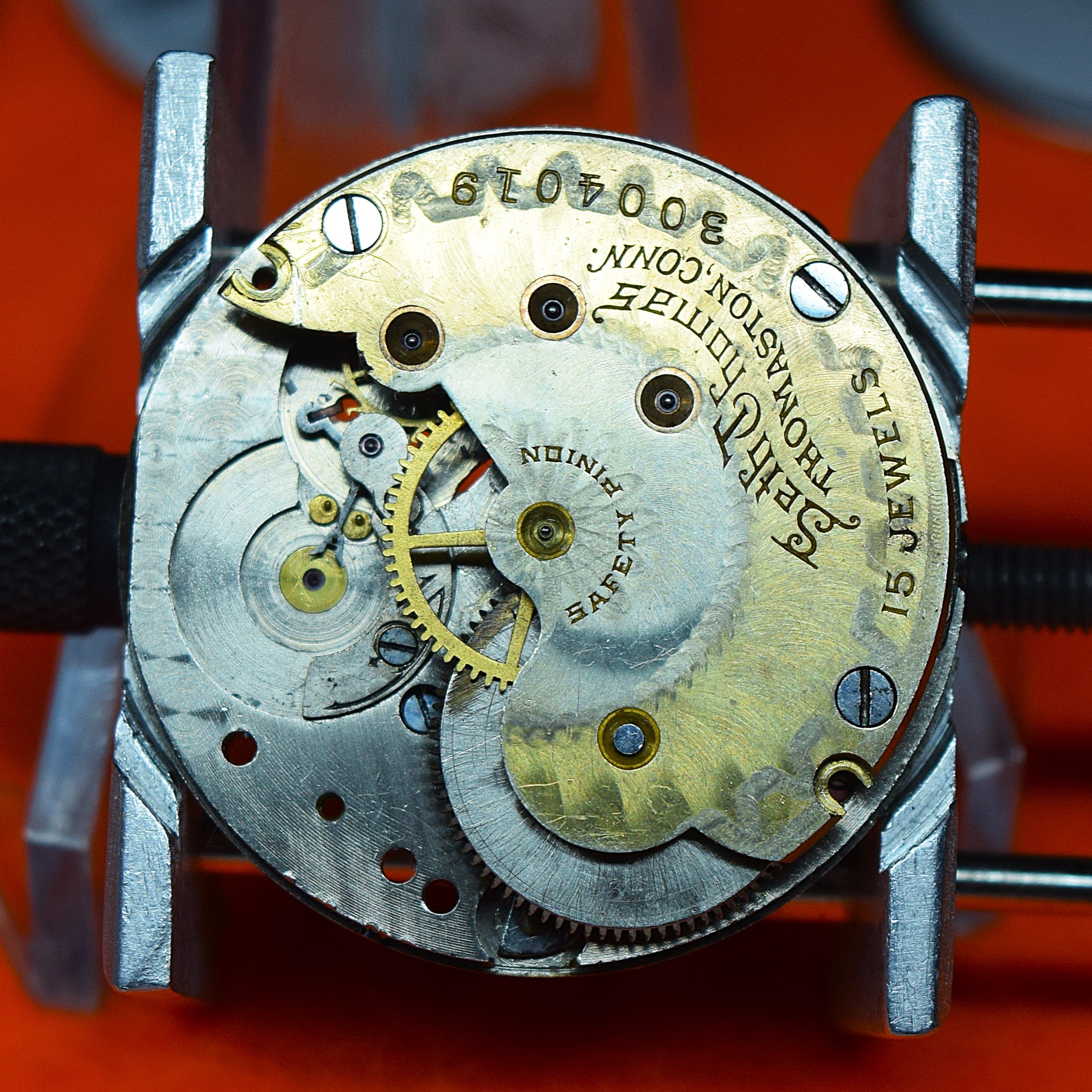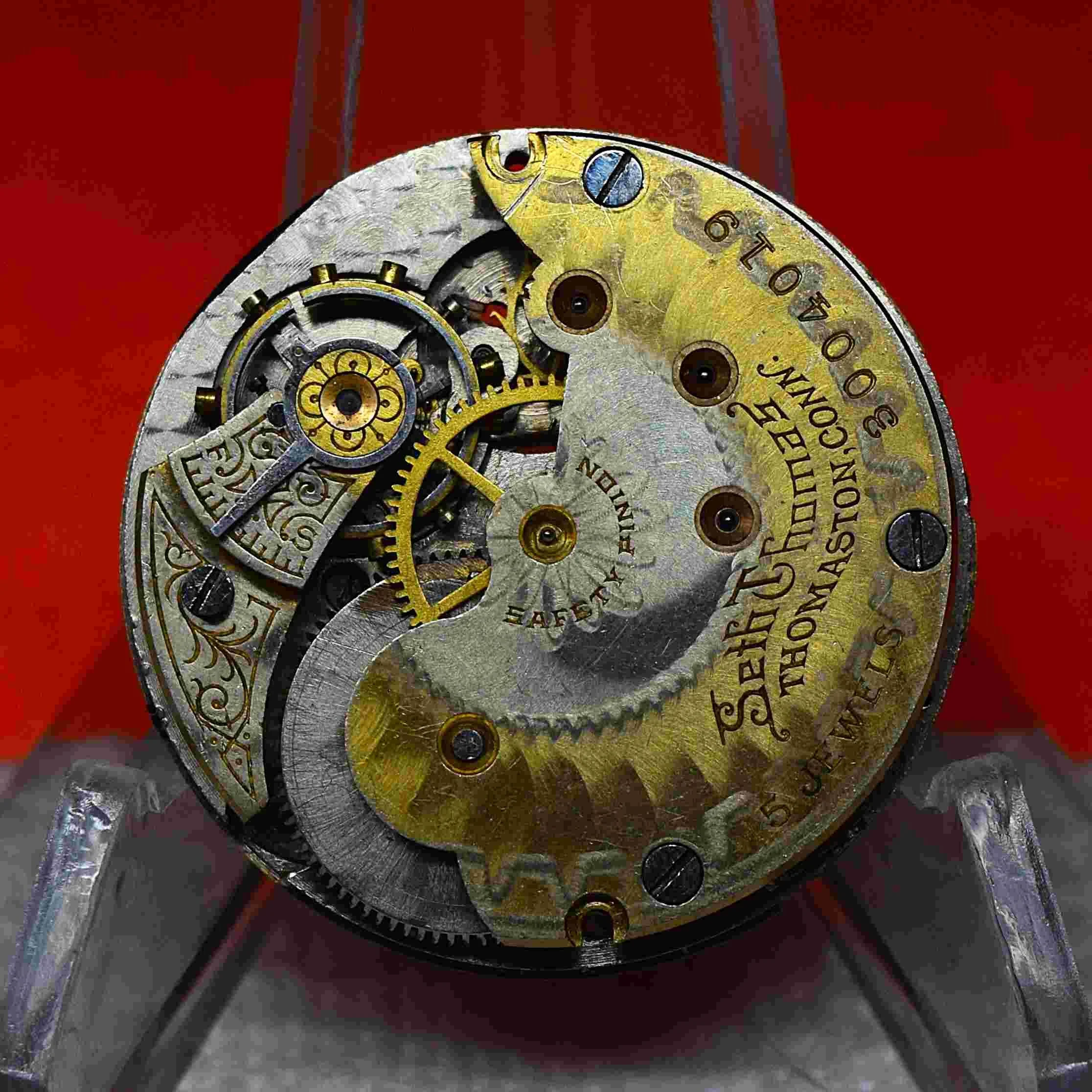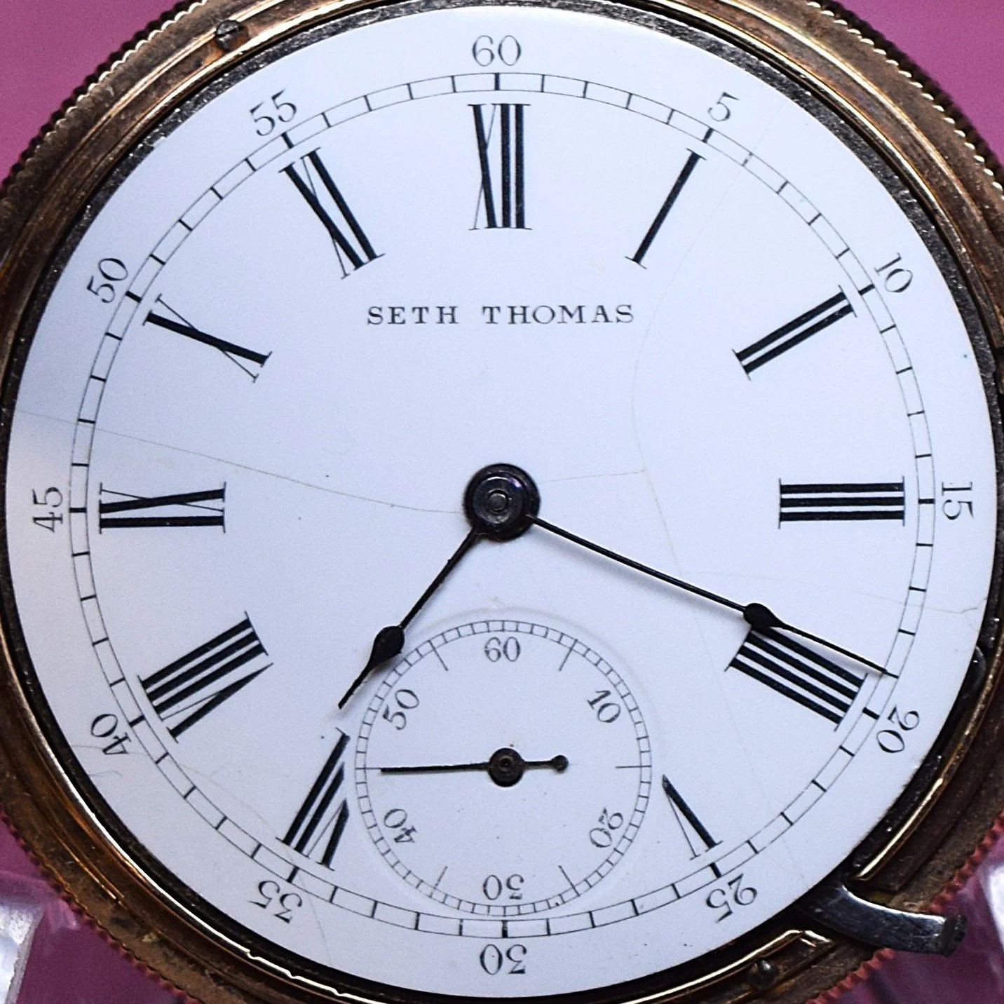 This 1912 Seth Thomas 6-size hunting Model 19 pocket watch was manufactured with a two-tone finished 3/4 plate, 7 jewels, and it is non-adjusted. The movement is stem wound and pendant set, with a Breguet hair spring, and plain/simple regulator. Its serial number is 3003803, and its grade is Seth Thomas numbered grade 35. The movement is signed “Seth Thomas Thomaston, Conn.”.