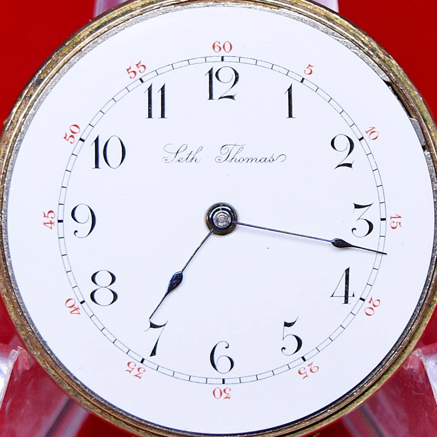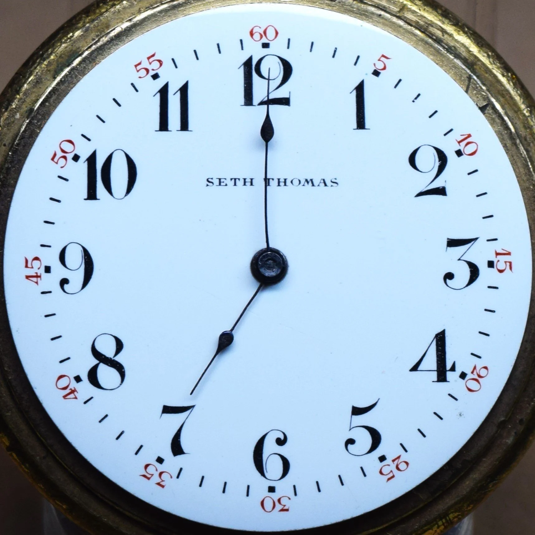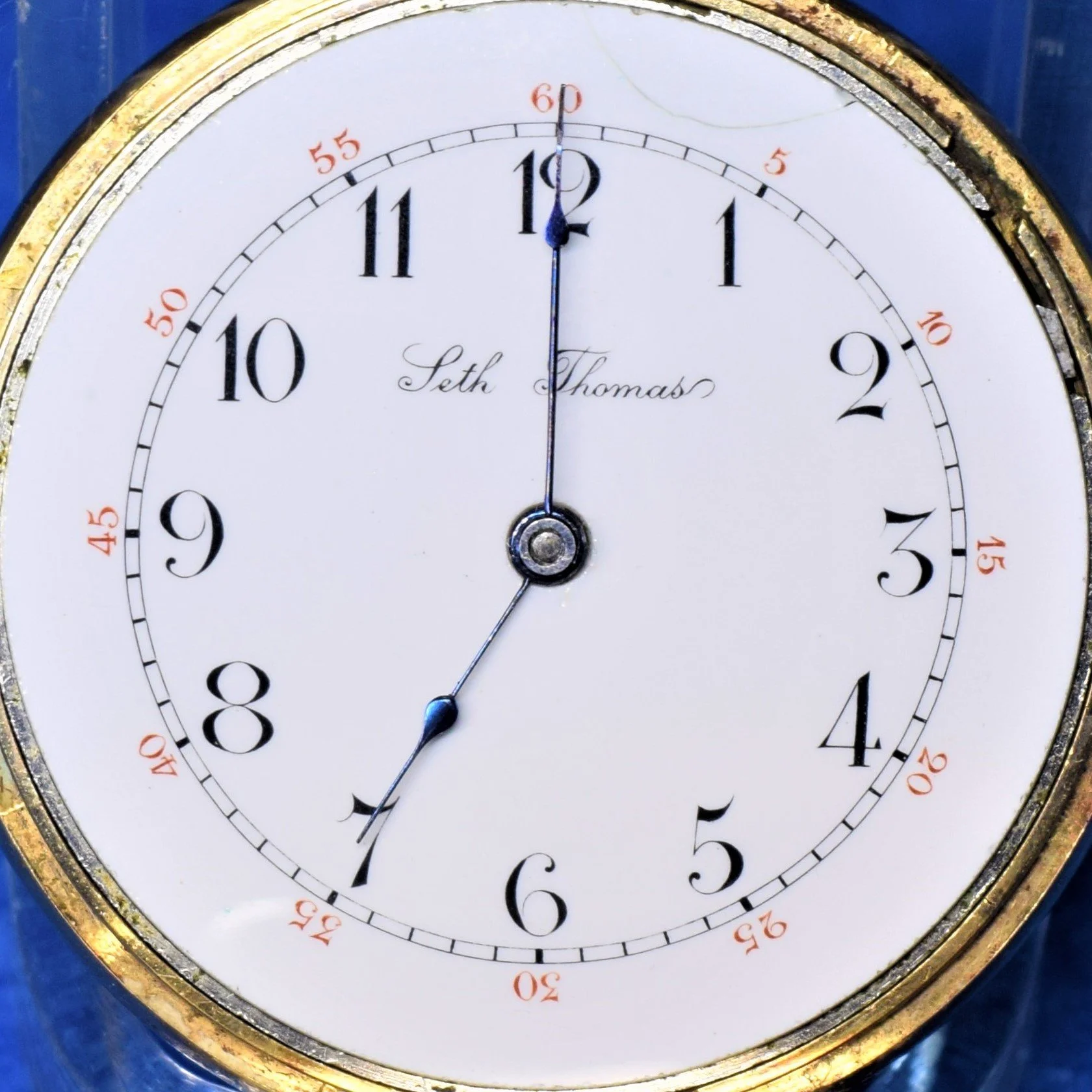 The movement presents with a 6-size Seth Thomas #1202 Arabic snug dial with a ring minute track and red five-minute marginals; fitted with Seth Thomas #1271 blued spade hands. The dial has no seconds bit and transforms apparent configuration of the movement from hunting to open-face.