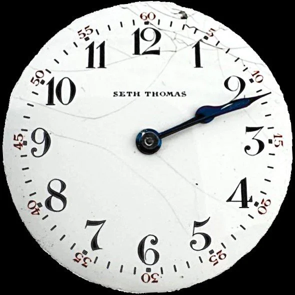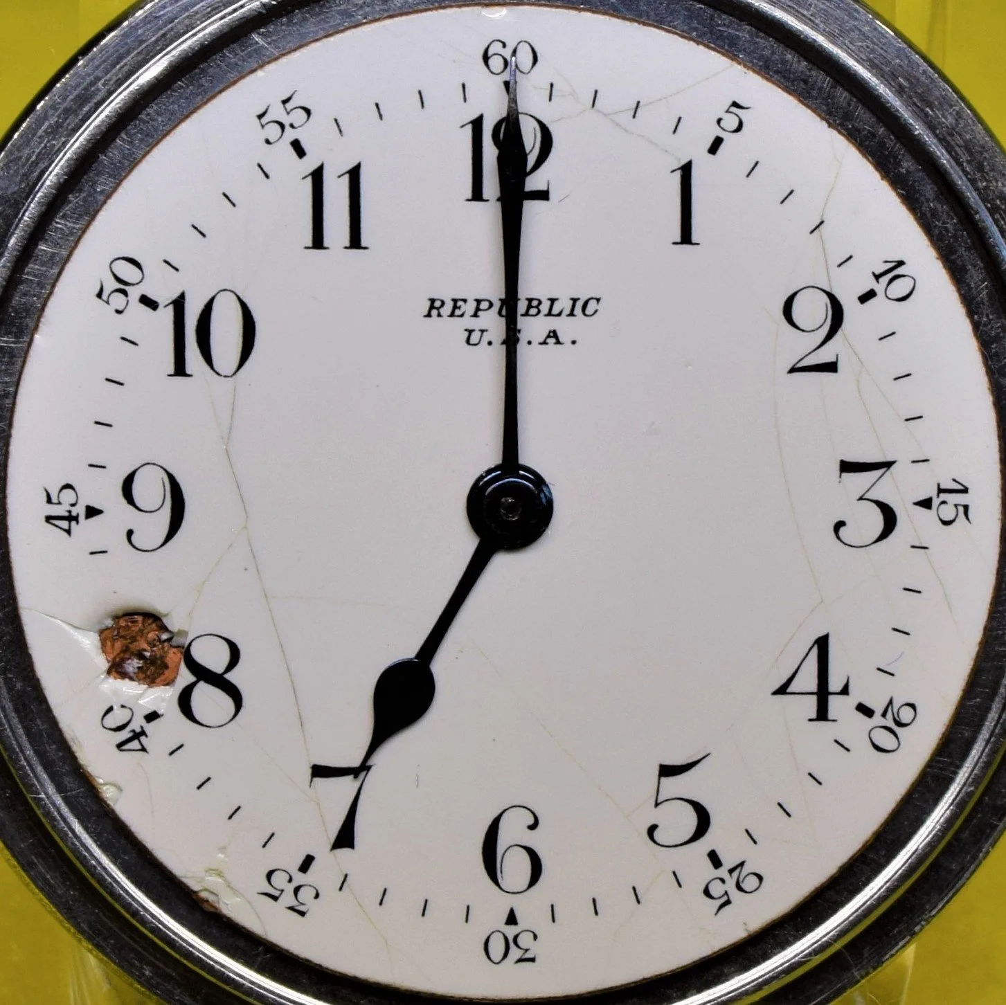 The movement presents with a 6-size private label REPUBLIC U.S.A. Arabic dial with a hashmarks minute track and black five-minute marginals, fitted with Seth Thomas #1271 Spade Blue Hands - 6-size. Republic U.S.A. is a private label in Seth Thomas Model 12, Model 13, Model 18, Model 19, and Model 24 manufactured for Illinois Watch Case Co. by Seth Thomas Watch Co.