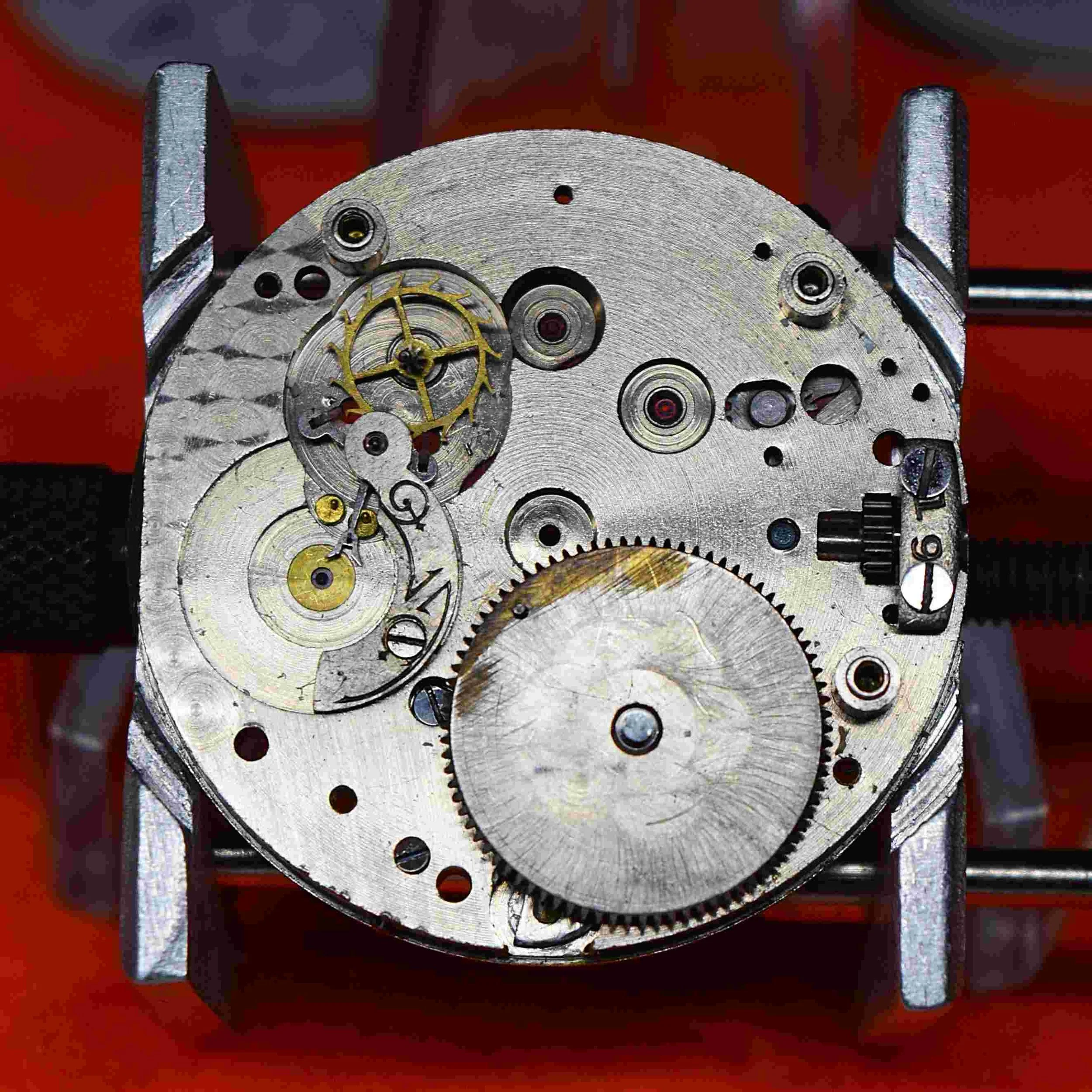 The movement is temporarily cased in a 6-size H. Muhrs Sons 14k 10-year gold-filled hunting pocket watch case, serial number 228410, for photographic purposes only.