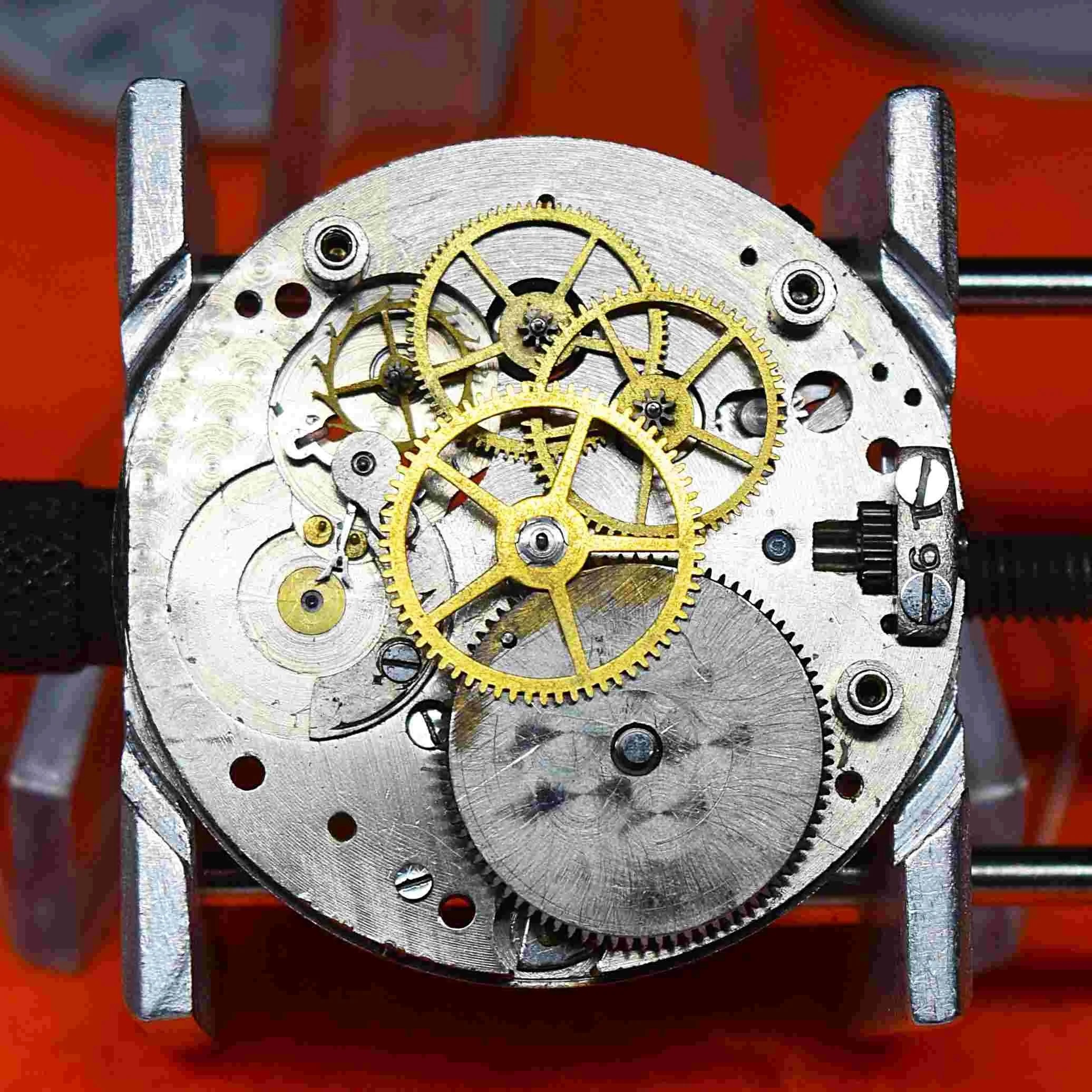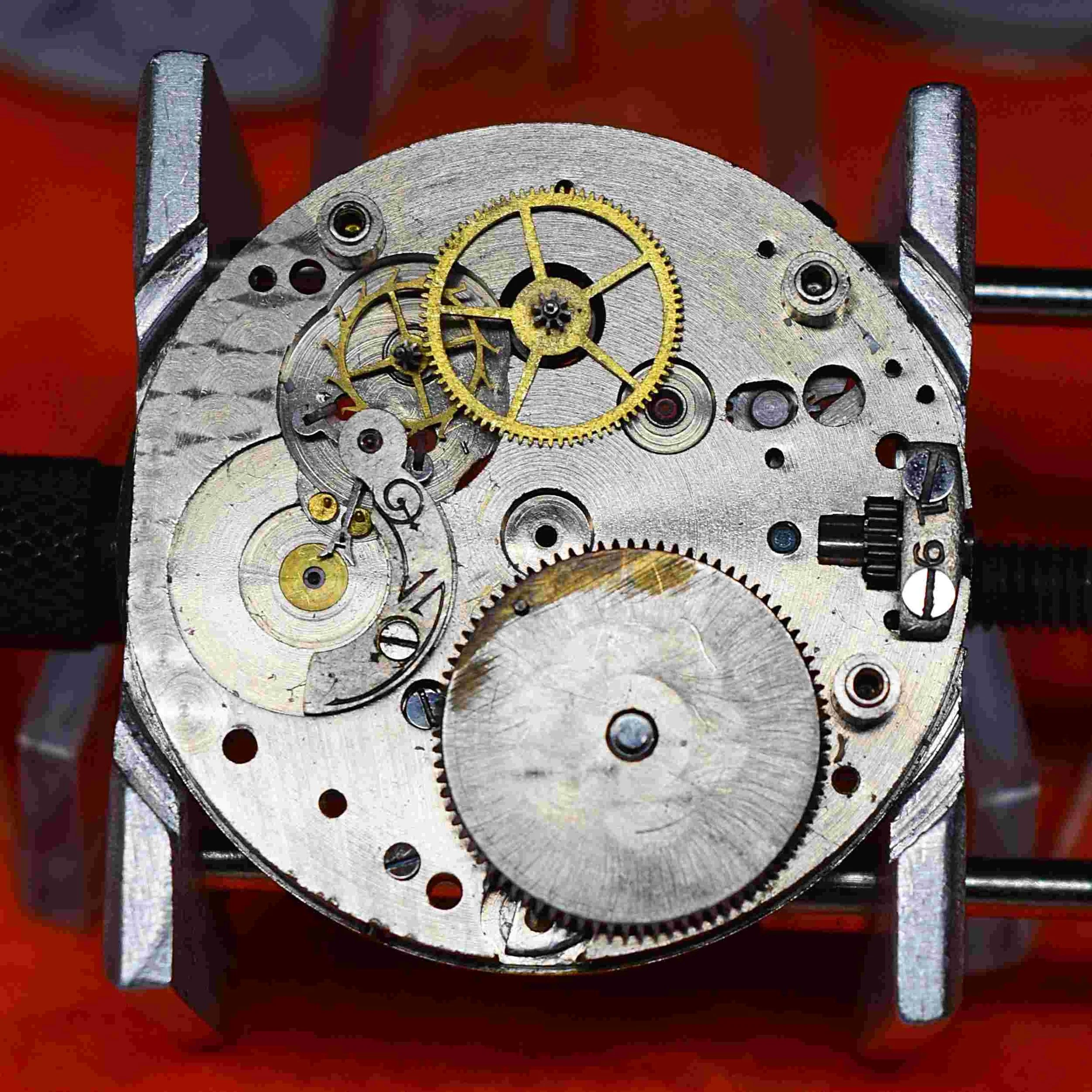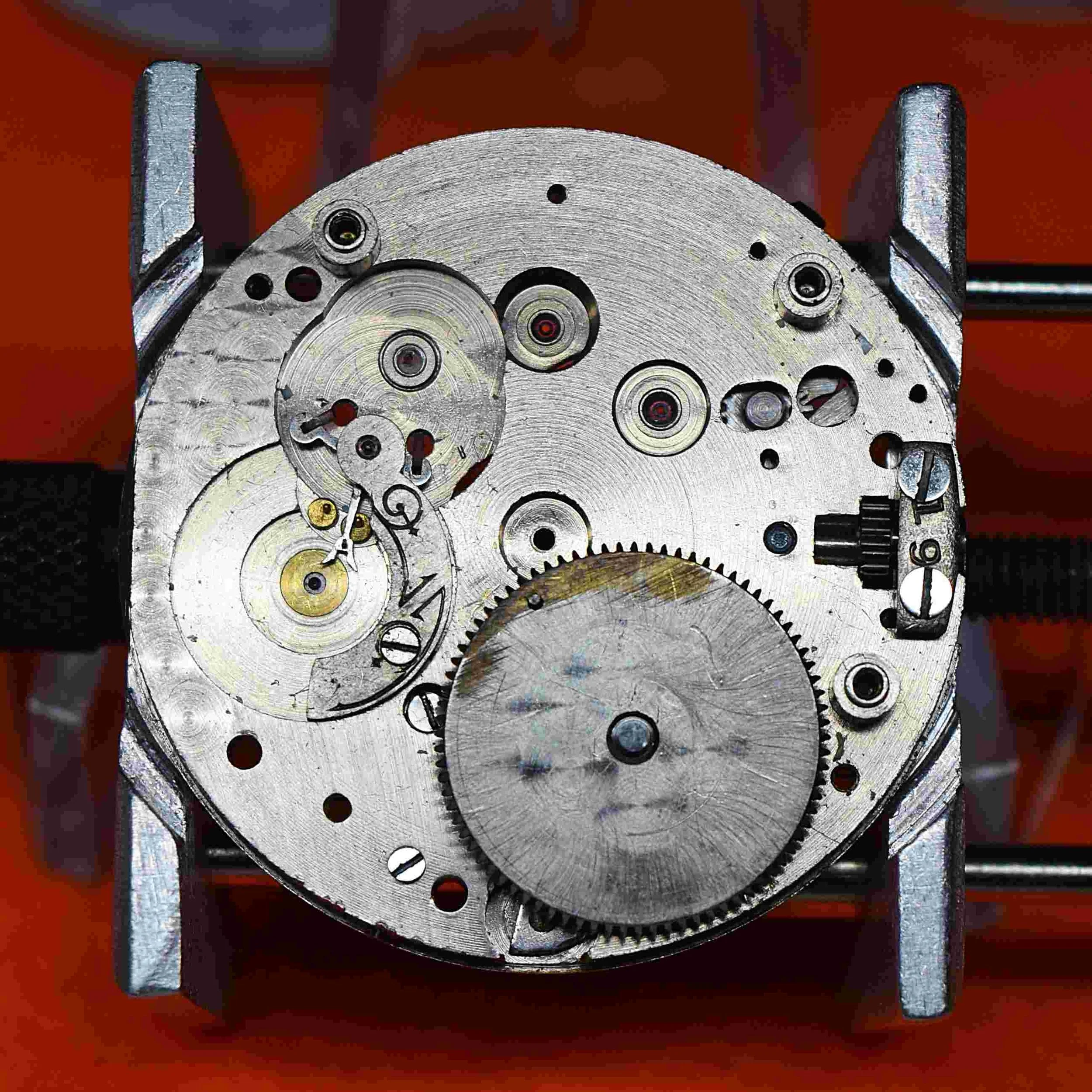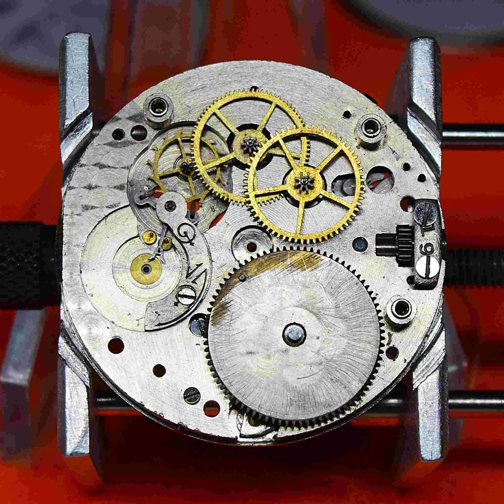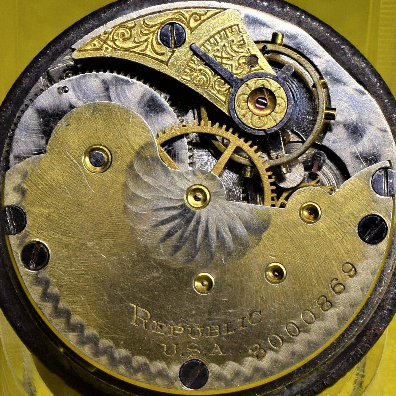 The movement presents with a 12X6-size Seth Thomas #1213 Arabic dial with a hashmarks minute track and black five-minute marginals, fitted with Seth Thomas #1277 blued spade hands 12-size. Republic U.S.A. is a private label in Seth Thomas Model 12, Model 13, Model 18, Model 19, and Model 24 manufactured for Illinois Watch Case Co. by Seth Thomas Watch Co.