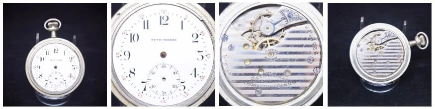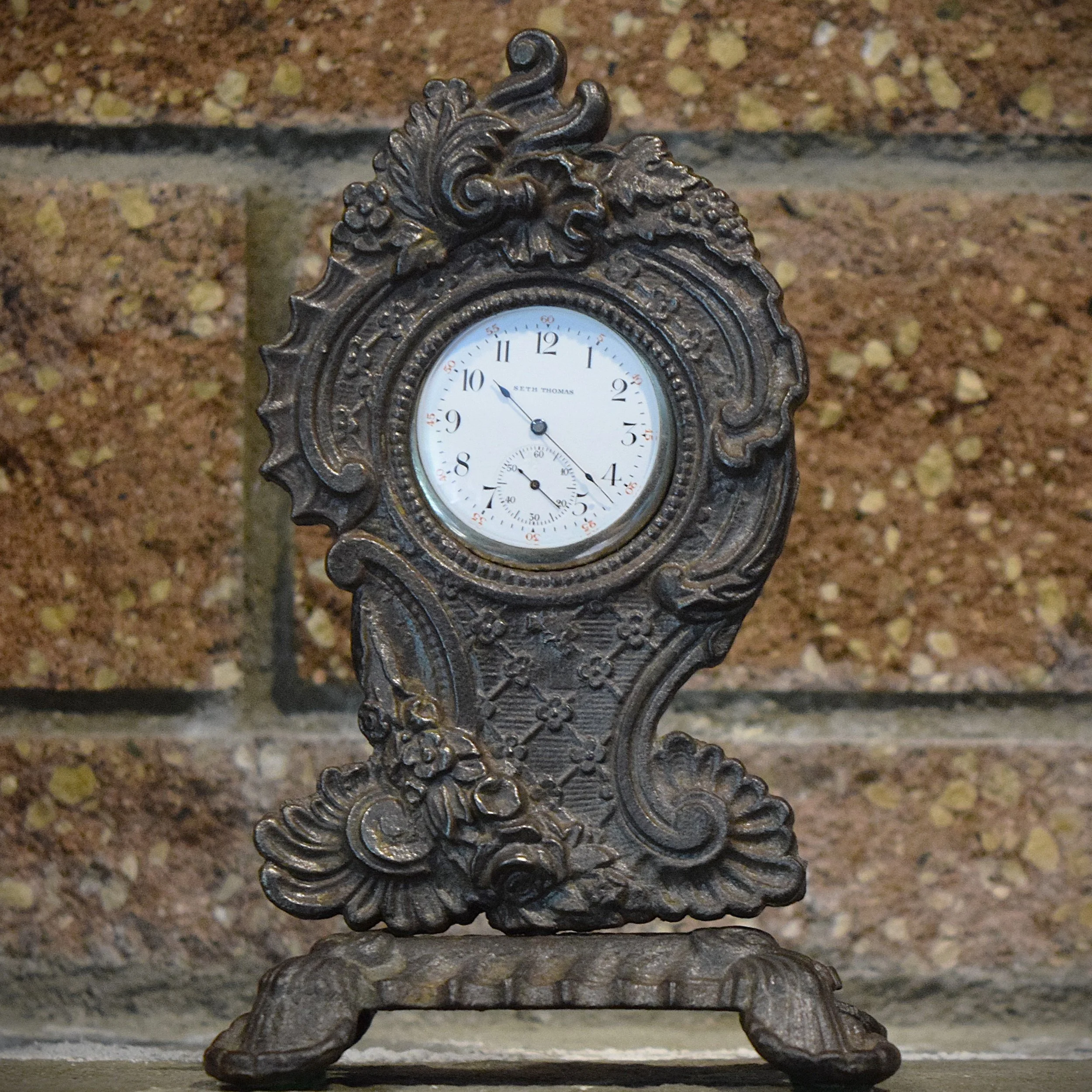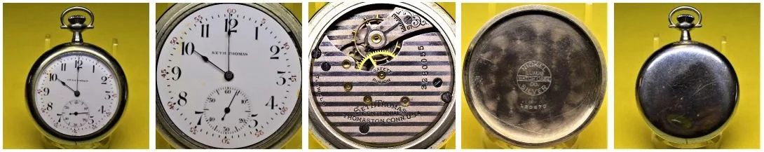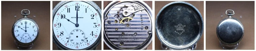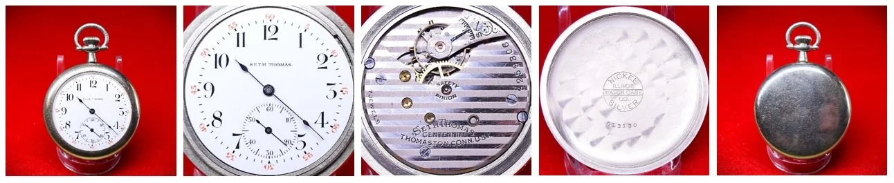 The movement is cased in a 12-size Illinois Watch Case Company Nickel Silver (nickel) open-face pocket watch case with screw back and bezel, serial number 013130. The movement also included a 6 1/2” tall X 4” wide cast iron pocket watch holder.